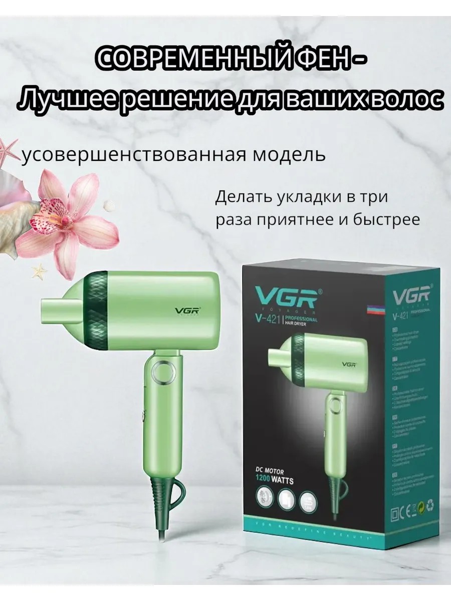 Фен VGR V‑421 — компактный дорожный помощник с аккуратным дизайном и мощной функциональностью. Складная ручка и лёгкий корпус весом около 300 г делают его идеальным спутником в поездках, спортзале или командировках. Модель оснащена DC‑мотором мощностью 1200 Вт, обеспечивающим стабильный и быстрый поток воздуха при минимальном шуме. Фен предлагает два режима скорости для оптимальной сушки волос в зависимости от необходимости, при этом количество температурных режимов — два, что гарантирует безопасный нагрев без риска перегрева