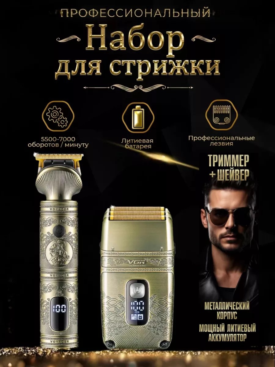 A professional 2-in-1 hair and beard trimming kit for barbers and personal use. This set is perfect for any barber shop! Designed to maintain smooth skin (dry shaving of stubble). Provides a safe shave, easy to use. A powerful charge allows you to shave several times without worrying about finding an outlet. An LED display shows the battery level. Features and benefits of the electric shaver: Waterproof housing with maximum protection IPX 6; Wet and dry shaving, can be used with shaving cream; USB charging of the razor; Ergonomic design; Travel lock; Small dimensions save space and allow you to take the razor with you on any trip. They are distinguished by their hardness and durability, which allows the machine to cope with the thickest and coarse hair. The professional trimmer is equipped with an innovative built-in Li-Ion 1200 mAh battery. You can trim both cordless and from the mains. Great for barbershop or home use. LED display shows the battery level. CHARACTERISTICS: Brand: VGR; LED display: shows the charge level; Indicator: battery charge, trimmer operation; Nozzles: (4 pcs) 1/3/5/7 mm; Battery: Li-on 1200 mAh; Charging time: 1.5 hours; Operating time on a full charge is 200 minutes; Power: 5 W; Motor: rotary 6500 rpm; Charging: USB cable without a block; Cord: 100 cm; Noise level: very low; suitable for a child; Application: Beard and mustache trimming; edging; Blade material: Stainless steel; Removable blade head; Knife width: 40 mm; Body material: Metal ; Size: 16x4.8x3 cm Machine weight: 230 g Package includes: Hair trimmer; nozzles - 4 pcs; USB cord without power adapter; cleaning brush; lubricating oil; instruction manual, gift box. Package includes: Trimmer, electric razor, attachments, brush, oil, charging cable, box.