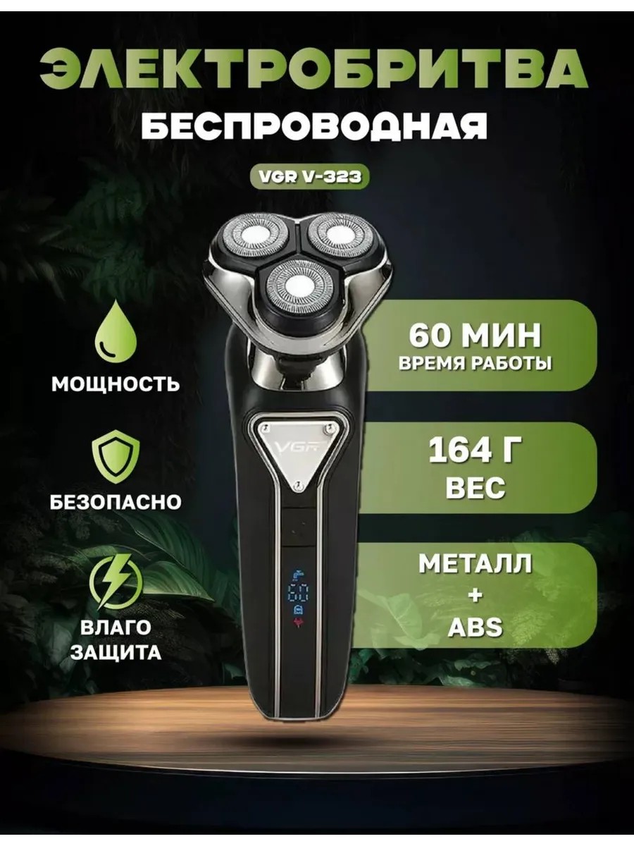 Электробритва VGR V-323 - создана специально для мужчин, которые хотят всегда хорошо выглядеть как дома. Бритва оснащена триммером и полностью водонепроницаемая. Электробритву VGR V-323 удобно брать с собой в дорогу так как аккумулятора довольно-таки на долго хватает а многим приходится бриться каждый день.Водозащита максимальная IPX 6. Электробритва VGR V-323 полностью моющаяся и её удобно промывать под проточной водой для очистки.- Для сухого и влажного использования. VGR V-323 можно использовать с водой, пеной, гелем или даже в душе. Это позволяет сделать Ваше бритьё освежающим и увлажняющим, сохраняя качество бритья.- 3 плавающих бреющих головки которые максимально плотно соприкасаются с кожей лица, осуществляется комфортное и лёгкое бритьё.- Аккумулятор заряжается за 1,5 час и обеспечивает до 90 минут работы.- Новейший литий-ионный аккумулятор работает эффективно и надежно. Для одного бритья достаточно быстрой 5-минутной зарядки. электробритва мужская / бритва / электробритва / электрический бритва / бритва электрический / электррбритва женская / электробритва браун / электробритва филипс / электробритва braun / электробритва philips / электробритва xiomi / электробритва для головы