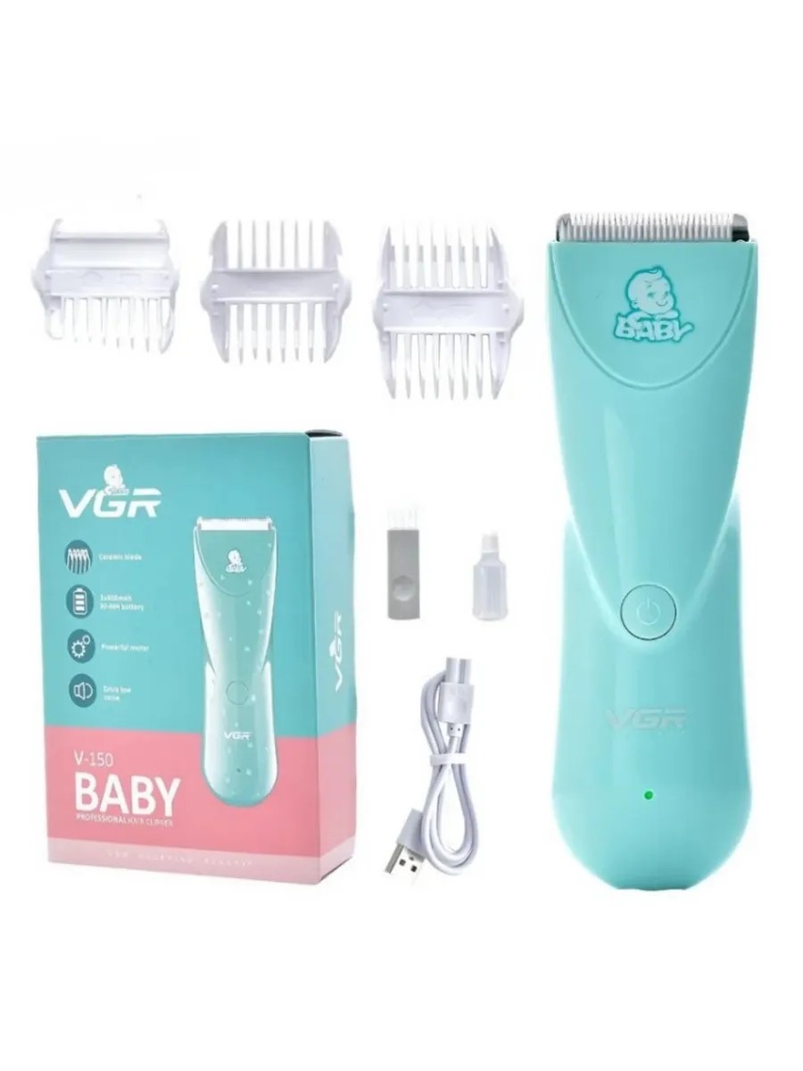 Аккумуляторная детская машинка для стрижки волос V-150 с пониженным уровнем шума и насадками для аккуратной и бережной стрижки детей с самых малых лет. Кроме самой машинки в комплект входит: