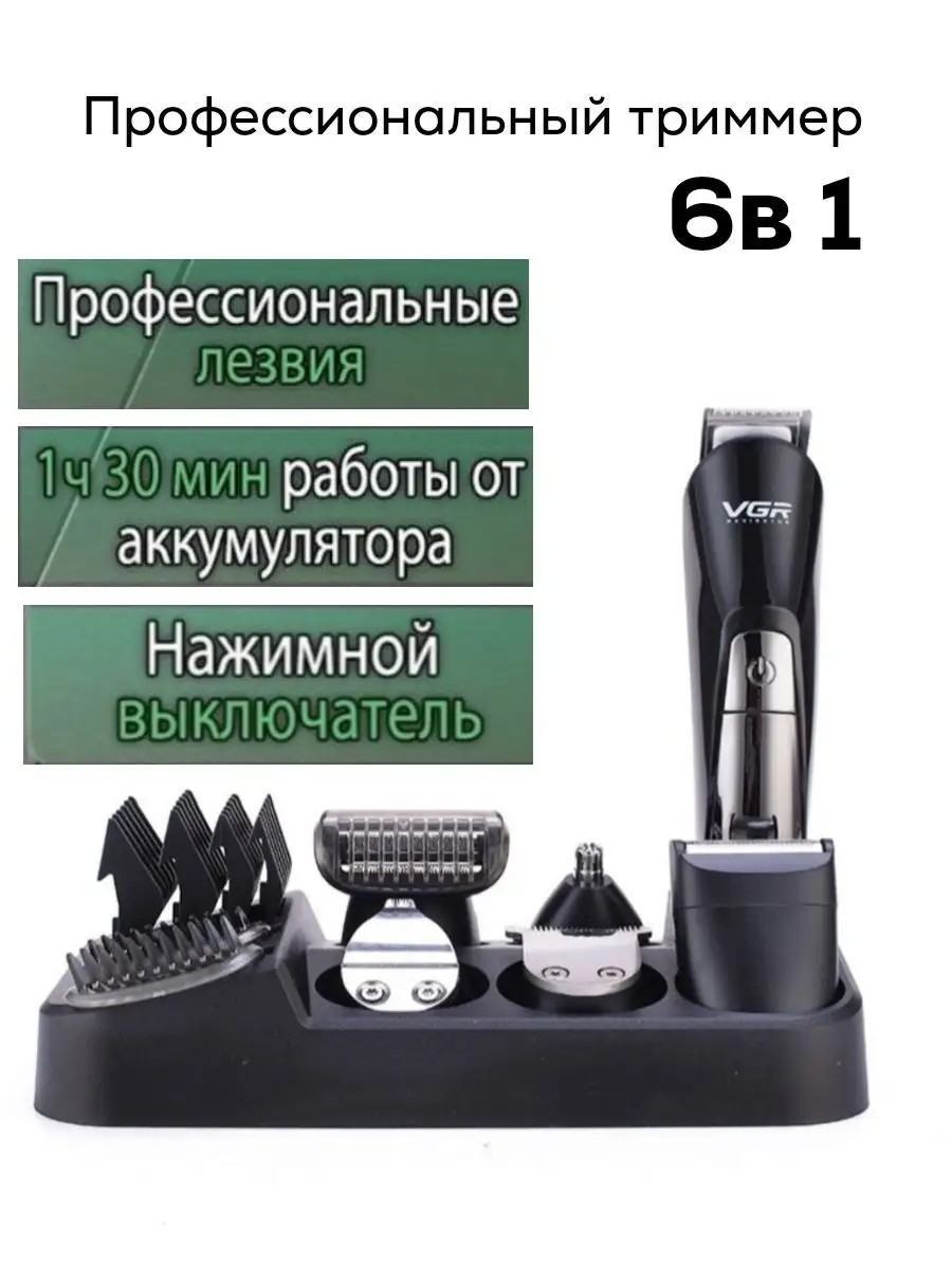 Профессиональная машинка для стрижки волос VGR. Триммер для бороды и усов приведет в порядок прическу, брови, бороду и усы, не выходя из дома. Это мужская роторная электро машинка 6 в 1 для взрослых и детских стрижек. В наборе: беспроводная электрическая машинка с 3 уровнями регулировки лезвий (длины среза), подставка с подзарядкой, 4 насадки гребня (3, 6, 9 и 12 мм), триммер для носа и ушей, окантовочная насадка стайлер для окантовки 8 мм, сеточная бритва (шейвер) для бритья бороды, БЛОК ПИТАНИЯ USB (юсб) /В СЕТЬ НЕ ИДЁТ В КОМПЛЕКТЕ!, масло, расческа, щетка для очистки. Эта модель заменит сразу несколько приборов - электробритву, машинку для стрижки волос, тример для бороды, усов и стрижки волос в носу и ушах. Триммер для волос работает от сети и встроенного аккумулятора (1 час непрерывной работы). Мощность: 3 Вт. Диодный индикатор горит красным, когда машинка подключена к сети. Лезвия (ножи) из нержавеющей стали можно мыть. Универсальная машинка для стрижки волос и бороды - отличный подарок для современных мужчин
