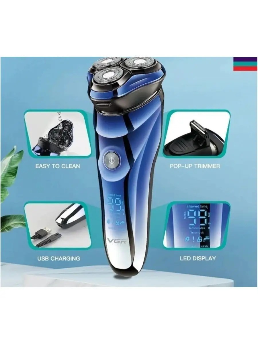 Профессиональная беспроводная водонепроницаемая электробритва VGR V-305. Вы сможете гладко бриться и комфортно бриться. Роторная электробритва тремя подвижными головками, которые идеально подойдет для кожи с высокой чувствительностью. Бритвенная головка отделена от лица сеточкой, которая исключает вероятность пореза и снижает раздражающее воздействие и позволяет убирать волосы под 0 мм. Подходит как мужчинам так и женщинам. Режущие элементы бритвы изготовлены из нержавеющей стали, которая обеспечивает высокую надежность и долговечность. На рукоятке бритвы расположен умный LED дисплей, он отображает оставшийся заряд в минутах, оповещает о необходимости отчистки лезвий и зарядке, также по окончанию бритья на дисплее отображается затраченное время на процесс. Электробритва оснащена режимом блокировки для защиты от нежелательного включения, чтобы его активировать зажмите кнопку включения и удерживайте в течении 3-х секунд, для выключения режима, повторите действие. Его очень удобно брать в поездку или путешествие, потому что машинка имеет маленькие габариты и специальный мешочек в комплекте. Вы сможете отказаться от Т-образных станков и бриться с комфортом, не рискуя порезаться и уберегая кожу от раздражения. Отличный подарок мужу парню папе отцу сыну брату. Является одним из лучших аналогом электробритв Braun.