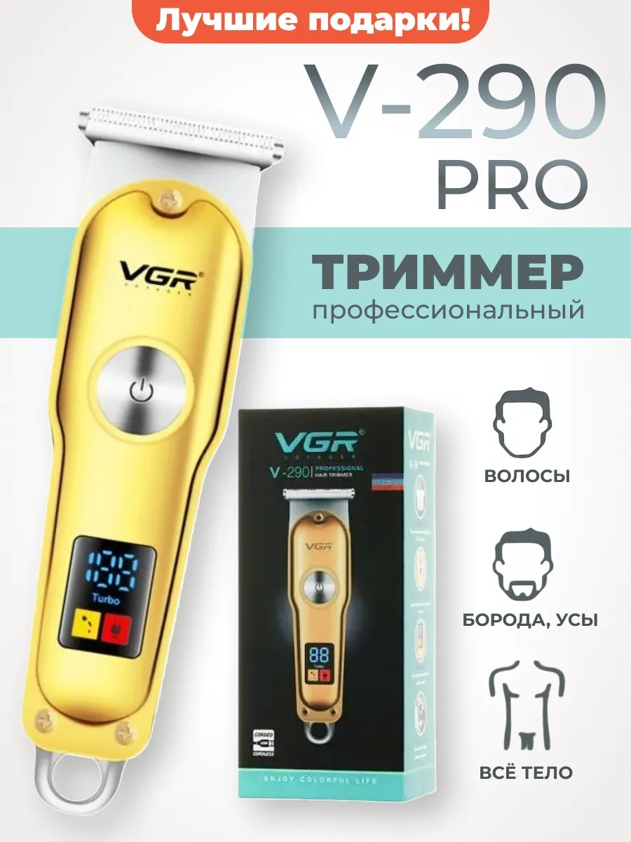 The VGR V-290 beard trimmer, also known as a hair clipper, is USB-rechargeable, features three interchangeable attachments for adjustable length, and durable titanium-coated stainless steel blades. Its undeniable advantages and attractive price have made this men's trimmer a global bestseller. This shaving trimmer is an innovative device designed specifically for real men—a cordless haircut and grooming machine. A diverse combination of attachments and modes allows you to realize any vision for a perfect look. With the VGR, untidy stubble will become well-groomed and stylish—all it takes is one stroke. It operates corded or battery-powered. The battery level is indicated by a digital display. It is designed for both home and professional use. The turbo mode provides an effective yet fast trim. The safe, straight-tipped blades are made of carbide-tipped stainless steel. Titanium coating of knives provides additional protection of blades from wear. The trimmer charges in just 2 hours and this is enough for 120 minutes of work on a single charge. Display with indication of charge level and selected mode. Large and convenient power button + turbo mode activation. Durable monolithic body with splash protection and a loop for hanging. Dimensions: 15x3.4 x4 cm, power: 5 W. This gift set will be a great gift for any holiday, for both men and women. Our store offers different models of trimmers Geemy GM-6609, GM-6149, GM-6627, GM-6675, GM-6567, GM-672; VGR V-290, V-720, V-017, V-979, V-130, V-696, V-106, V-649; Kemei KM963.