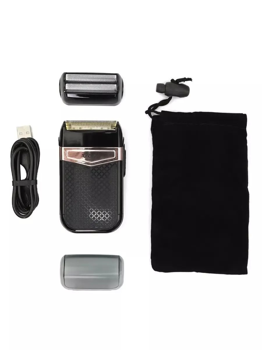 Men's Electric Shaver V-331 Double blade for a quick and comfortable shave. The trimmer is packaged in a gift box. This shaving machine will make a wonderful gift for a loved one. Razor for beard, nose, face. Text when image loading is disabled in the browser. Men's electric shaver package includes: Beard trimmer, velvet case, replacement head, USB charging cable, cleaning brush. Replaceable attachments are easy to replace in a couple of strokes. Capacious battery - up to an hour of operation on a single charge. USB port for charging anywhere - from a PC, car, or outlet. Expensive and pleasant to the touch shaver body fits comfortably in the hand. Waterproof body, so the blades can be washed under the tap. The trimmer is made of high-quality material and will serve you for many years. Can be used for professional haircuts and amateur home haircuts.