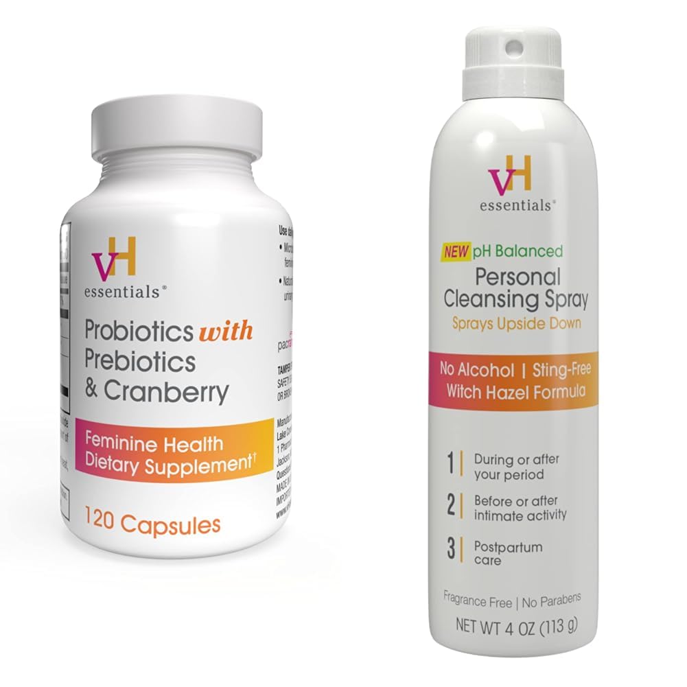 This feminine health bundle includes vH essentials Probiotics with Prebiotics and Cranberry Feminine Health Supplement Capsules (120 count) to support vaginal and urinary tract health, as well as vH essentials Personal Cleansing Spray (4 floz) for external intimate cleansing. The probiotic capsules contain a proprietary blend of probiotics, prebiotics, and cranberry powder to promote both feminine and urinary tract health. Specifically, it includes 12 strains of Lactobacillus, Bifidobacterium, and Streptococcus probiotics, fructo-oligosaccharides prebiotics, and 300mg of cranberry powder per serving. The cranberry powder adds antioxidants that further support urinary tract health. Complementing the capsules, the vH essentials Personal Cleansing Spray serves as a fragrance-free, pH balancing lactic acid spray for external intimate cleansing. It can be used during menstruation, before or after intercourse, or postpartum to effectively wash away residue and odor. The spray contains witch hazel to soothe the intimate area. Its upside-down spray design improves front-to-back cleansing between showers as a natural alternative to douching.