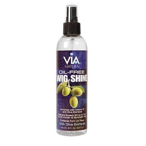Enriched with Vitamin E and Olive Extracts: Delivers Superb Shine to Dry and Dull Human and Synthetic hair. Protects from UV Rays. Via Natural Oil Free WIG SHINE contains a unique blend of ingredients designed to impart shine but without oil to wigs, weaves and extensions. This spray penetrates quickly and easily without leaving a greasy feel or a greasy look.