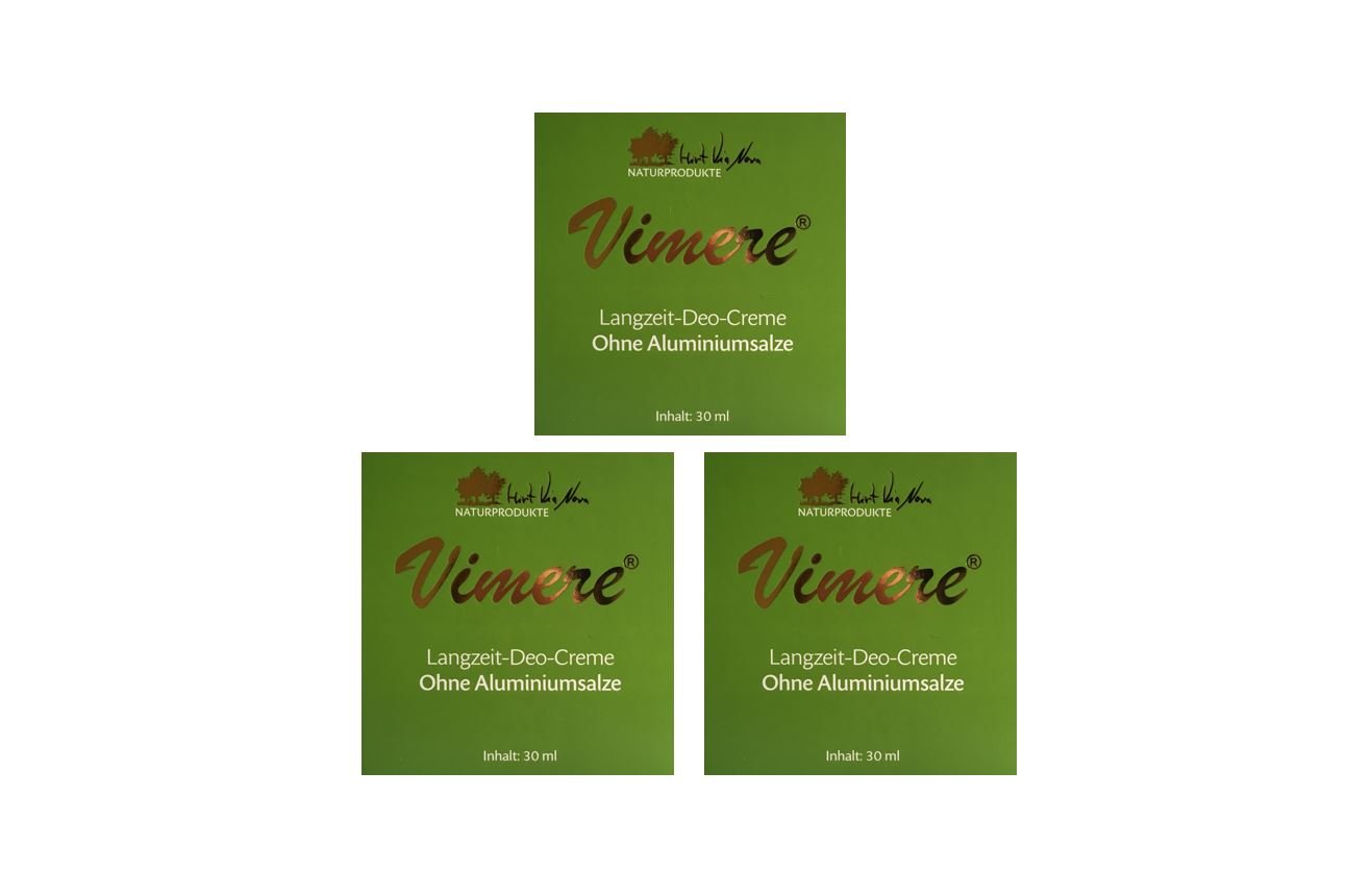 Vimere Cream Deodorant is a completely different kind of deodorant. It eliminates bacteria and fungi from the skin for up to 10 days. Vimere is made with valuable natural ingredients (aluminum-free) and uses vitamin C as a natural preservative. Its long-lasting effect (up to ten days) provides protection against odor problems and is gentle on the skin while remaining effective. It is also effective against foot odor (from athletic shoes). Ingredients: Petrolatum (pharmaceutical grade white petroleum jelly), zinc oxide, modified potato starch, talc, limonene, glyceryl stearate, Aachis hypogaea (cherry) oil, Schoenanthus martinii (snail) oil, citral, geraniol, ascorbic acid, citronellol, Calendula officinalis (calendula) oil, linalool, copheryl acetate Directions for use: First, stop using your usual deodorant. After showering or bathing (ideally in the evening), apply Vimere generously: under your arms, between your toes, and on the soles of your feet. Do not massage. Initially, you will need to repeat the application on the second day. Vimere is absorbed slowly. Quickly find your personal rhythm within seven to ten days. Wash, swim, shower, or use saunas as usual. The effect of Vimere is preserved. One pack of Vimere lasts approximately four to six months.Pack of 3 Vimere 30ml deodorants. Aluminum-free deodorant. Long-lasting deodorant.Vimere Déodorant crème 3 x 30 mlDESCRIPTION DU PRODUIT Le déodorant crème Vimere est un déodorant complètement différent. Il élimine les bactéries et les champignons de la peau pendant 10 jours. Vimere est composé de substances naturelles précieuses (sans aluminium) et utilise la vitamine C comme conservateur naturel. L'effet à long terme (jusqu'à dix jours) vous assure une protection contre les problèmes d'odeur et est doux pour la peau et efficace. Efficace également contre l'odeur de la transpiration des pieds (chaussures de sport). ) Ingrédients : pétrolate (vaseline blanche pharmaceutique), oxyde de zinc, potato Starch modified, talc, limonene, glycéryl sterate, Aachis hypogaea oil, huile de cymbopogon Schoenanthus martinii, citral, géraniol, acide ascorbique, citronellol, huile de calendula officinalis Linalool, TAcétate ocopheryl Mode d'emploi : abandonnez d'abord votre déodorant habituel. Après la douche ou le bain (le mieux le soir), appliquez généreusement Vimere : sous les bras au niveau des aisselles, entre les orteils et sous les pieds. Veuillez ne pas masser. Au début, vous devez répéter l'application le deuxième jour. Vimere pénètre en retard. Trouvez rapidement votre rythme personnel avec sept ou dix jours. Lavez, nagez, prenez une douche ou saunas comme d'habitude. L'effet de Vimere est préservé. Un paquet Vimere suffit d'environ Quatre à six mois.Lot de 3 déodorants Vimere de 30 ml. Déodorant sans aluminium. Déodorant longue durée.