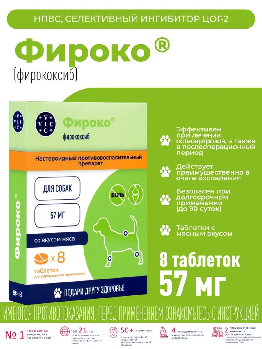 Фироко 57 мг- нестероидный противовоспалительный препарат, селективный ингибитор ЦОГ-2 для собак. Аналог препарата Превикокс 57 мг.