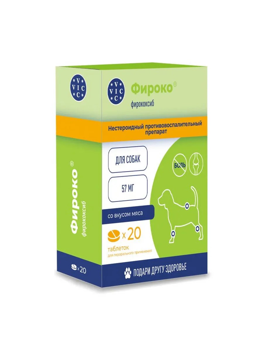 | Полное наименование товара | VIC, Фироко 57 мг нестероидный противовоспалительный препарат для собак - 20 таблеток |