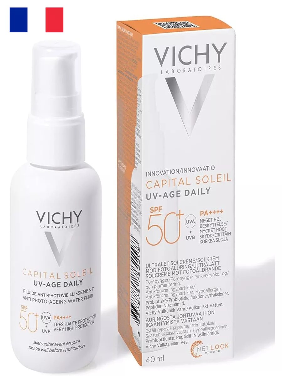 Защита кожи от солнечных лучей – это не просто необходимость, а важный шаг к сохранению ее молодости и здоровья. Виши Капитал Солей Uv-Age предлагает невесомый солнцезащитный флюид для лица SPF50+, который станет вашим надежным союзником в борьбе с признаками фотостарения. Этот продукт, произведенный во Франции, обеспечивает очень высокую степень защиты от UVA и UVB-лучей, что позволяет вам наслаждаться солнечными днями без лишних забот.Инновационная формула флюида, обогащенная вулканической термальной водой VICHY, пробиотической фракцией, пептидом и ниацинамидом, активно защищает кожу от пигментации, преждевременных морщин и снижения эластичности. Более 80% признаков старения кожи связаны с воздействием UV-лучей и негативной экологической обстановкой. Поэтому так важно выбирать средства, которые не только защищают, но и восстанавливают.Флюид обладает легкой и нелипкой текстурой, которая не ощущается на коже и устойчива к поту, что делает его идеальным для активного образа жизни. Благодаря запатентованной технологии NETLOCK, Vichy Capital Soleil создает на поверхности кожи невидимую защиту, которая не требует постоянного обновления. Это особенно важно для тех, кто проводит много времени на улице.Этот продукт прошел дерматологическое и офтальмологическое тестирование, что подтверждает его безопасность для чувствительной кожи и отсутствие раздражения слизистой глаз. Гипоаллергенная формула делает флюид подходящим для всех типов кожи, обеспечивая надежную защиту без риска аллергических реакций.Французская косметика Vichy славится своим качеством и эффективностью, и солнцезащитный флюид не является исключением. Он не только защищает, но и ухаживает за вашей кожей, обеспечивая антиоксидантную защиту от негативного воздействия окружающей среды и инфракрасного излучения. Выбирая Виши Капитал Солей, вы предотвращаете появление признаков старения.Подарите себе уверенность и красоту с Vichy Capital Soleil Uv-Age — вашим идеальным спутником в солнечные дни!