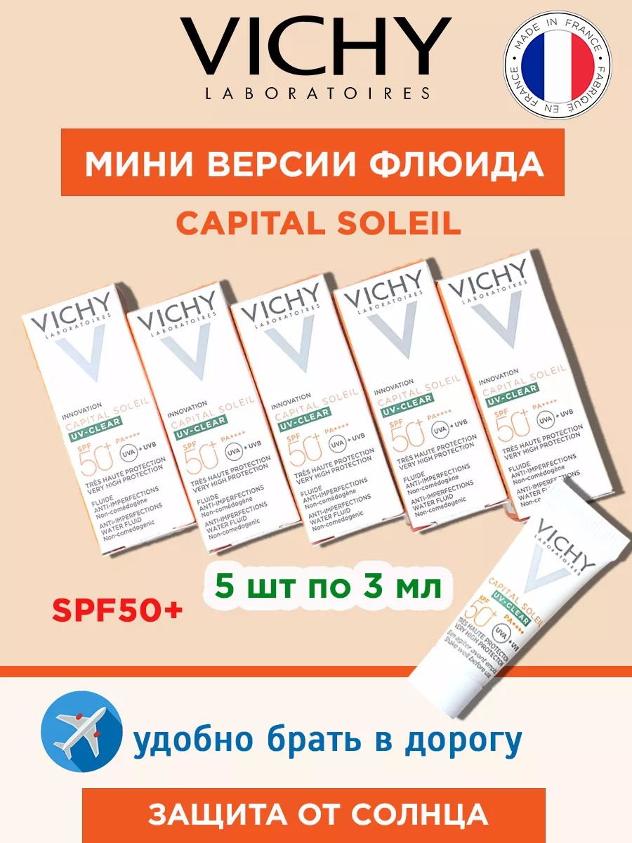 Vichy capital soleil флюид солнцезащитный для лица против несовершенств uv-clear spf50 – миниатюры 5 шт по 3 мл