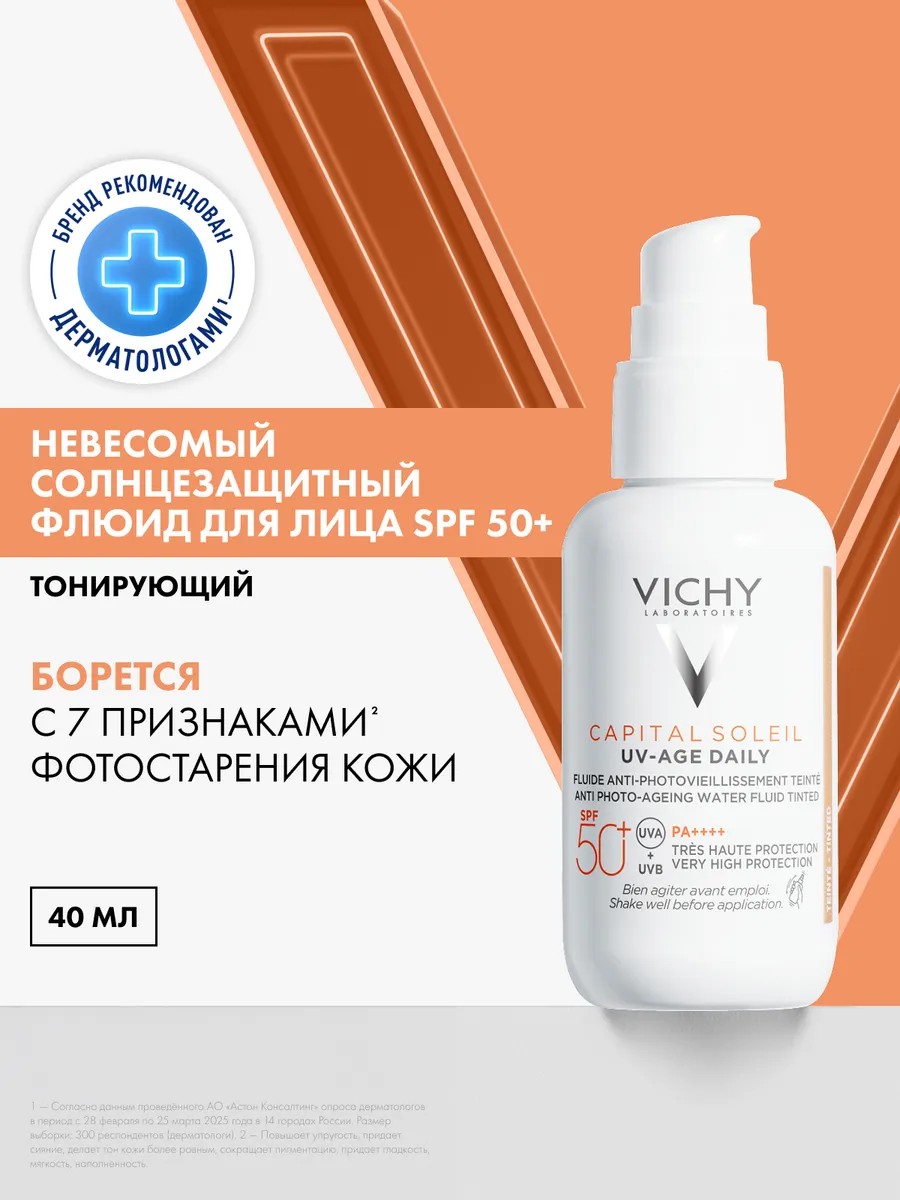 CAPITAL SOLEIL UV-AGE DAILY Weightless Sunscreen Fluid for the Face Against Signs of Photoaging Tinted Light SPF 50+, 40 ml. Active ingredients: The formula, enhanced with VICHY Volcanic Thermal Water, Probiotic Fraction, Peptide, and Niacinamide, protects against pigmentation, premature wrinkles, and decreased skin elasticity. Mineral pigments in the formula provide an even tone, without shine or stickiness. Patented NETLOCK technology creates weightless and invisible protection on the skin's surface. The light, non-sticky texture of the fluid is not felt on the skin and is sweat-resistant. How to use: Apply every morning over your basic skincare routine. Result: Fights pigmentation and wrinkles. Protects against negative environmental factors. Provides an even tone, without shine or stickiness.