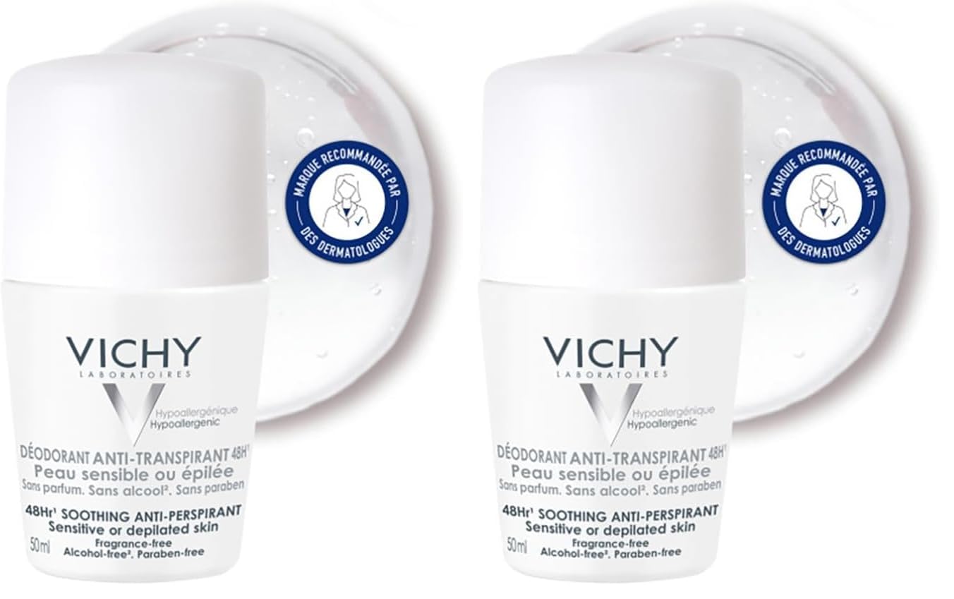 Vichy, Déodorant Anti-Transpirant 48H, Roll-On, Protège et Régule, Sans Alcool, Sans Parfum, Pour Peaux Sensibles, 50 ml 50 ml (Lot de 2)