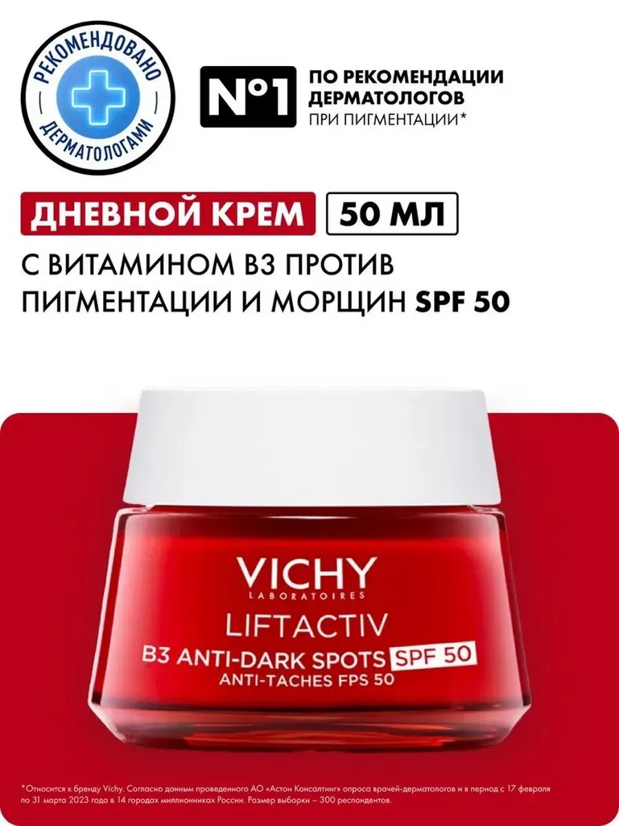 UV*- излучения являются одним из главных факторов появления пигментных пятен и морщин. Инновация** от VICHY: новый дневной крем LIFTACTIV С ВИТАМИНОМ B3 ПРОТИВ ПИГМЕНТАЦИИ SPF 50 – улучшенный эффективный антивозрастной уход с ниацинамидом (витамин B3) и пептидами в сочетании с фильтром широкого спектра SPF 50. Клинически доказанная эффективность: корректирует и предотвращает появление пигментных пятен**, сокращает морщины. ГИПОАЛЛЕРГЕННО. Протестировано на чувствительной коже под контролем дерматологов. Избегайте контуров глаз. *UV – Ультрафиолетовые **среди продуктов VICHY ***появившиеся вследствие УФ-излучения.