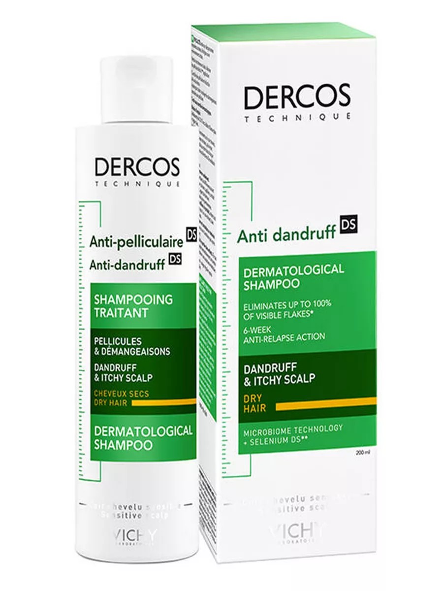 Looking for an effective dandruff treatment suitable for dry hair? Discover the unique Vichy Dercos shampoo, specifically formulated to address this problem. Made in Spain under the supervision of French experts, this shampoo offers comprehensive hair and scalp care. The Dercos line is renowned for its specialized products aimed at addressing hair loss, hair growth, and dandruff. Suitable for people over 20, this shampoo is ideal for cleansing dry hair. Its soft, creamy texture and pleasant scent make washing your hair not only effective but also pleasant. From the first use, you'll notice all visible dandruff flakes disappear. Thanks to its unique formula, which includes active ingredients, the shampoo inhibits the growth of pathogenic microorganisms, bacteria, and fungi, preventing the recurrence of dandruff for up to 6 weeks. You'll forget about discomfort and itching, and your hair will become supple and shiny. Vichy Dercos Anti-Dandruff Shampoo for Dry Hair maintains the skin's natural pH balance and hydrolipidic protection, soothing irritation and reducing inflammation. A breathable film not only protects the hair but also the scalp from moisture loss, while special sun filters neutralize harmful UV rays. Among the active ingredients are selenium sulfide, which promotes healthy scalp microbiomes, plant ceramides, which restore the epidermal barrier, and salicylic acid, which disinfects and exfoliates. Glycerin actively moisturizes and softens hair, while vitamin E protects against free radicals, strengthening hair and stimulating growth. Use the shampoo 2-3 times a week for 4 weeks to treat dandruff, and once a week is sufficient for prevention.