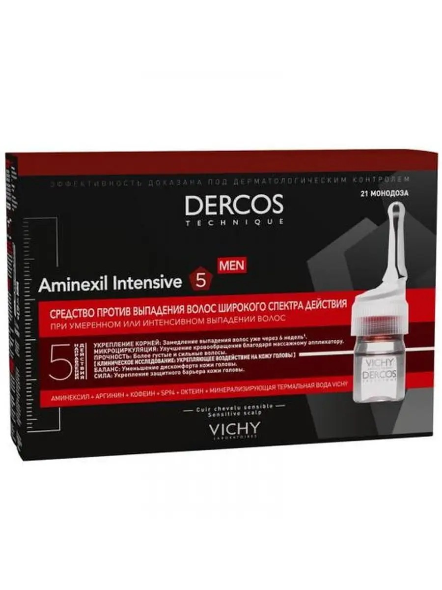 Средство Vichy Dercos Aminexil Intensive 5 против выпадения волос у мужчин в ампулах, 21 монодоза, 126 мл - комплексное средство против выпадения. Действует на корни, кожу головы и волокно волоса. Доказанная эффективность против выпадения в течение 6 недель. На 91% меньше выпадения после мытья головы. На 89% меньше выпадения в течение дня. Эффективность подтверждена клинически под дерматологическим контролем. Подходит для борьбы с умеренным и интенсивным выпадением волос. С помощью удобного массажного аппликатора средство легко распределяется по всей коже головы.Гипоаллергенная формула без парабенов протестирована под контролем дерматологов. Обладает оптимальной переносимостью и подходит для лечения алопеции даже на чувствительной коже головы. подарок