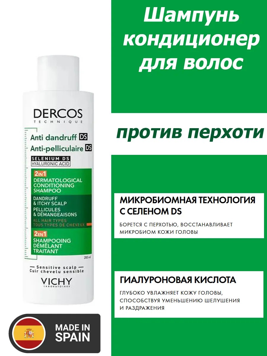Если вы ищете эффективное решение для борьбы с перхотью, обратите внимание на уникальный шампунь-кондиционер от известного французского бренда. Этот продукт, произведенный в Испании, сочетает в себе передовые технологии и заботу о здоровье ваших волос.Шампунь-кондиционер против перхоти 2в1 от Виши Деркос — это инновационное средство, которое гарантирует заметные результаты уже после первого применения. Формула, обогащенная гиалуроновой кислотой и дисульфидом селена, эффективно восстанавливает микробиомный баланс кожи головы, устраняя видимую перхоть и успокаивая раздражение. Вы забудете о дискомфорте и зуде, ведь этот продукт не только очищает, но и глубоко кондиционирует пряди, делая их мягкими и блестящими.Секрет эффективности этого шампуня заключается в его способности предотвращать повторное появление перхоти в течение шести недель. Благодаря 72 часам увлажнения ваши волосы будут выглядеть здоровыми и ухоженными, а цвет сохранится ярким и насыщенным. Легкость в расчесывании и улучшенное состояние волос — это еще одни преимущества, которые вы получите, используя данный продукт.Чтобы достичь максимального эффекта, просто встряхните флакон перед использованием, нанесите небольшое количество на влажные волосы, помассируйте кожу головы и оставьте на 2 минуты. Затем тщательно смойте водой. Обратите внимание, что шампунь-кондиционер Виши Деркос содержит сульфит селена, поэтому избегайте попадания в глаза и на поврежденную кожу.Выбирая этот дерматологически протестированный шампунь, вы делаете шаг к здоровью своих волос и кожи головы. Vichy Dercos предоставляет надежное решение, которое сочетает в себе научный подход и заботу о вашем комфорте. Не упустите возможность вернуть своим волосам красоту и здоровье, выбрав качественный уход от французского бренда.