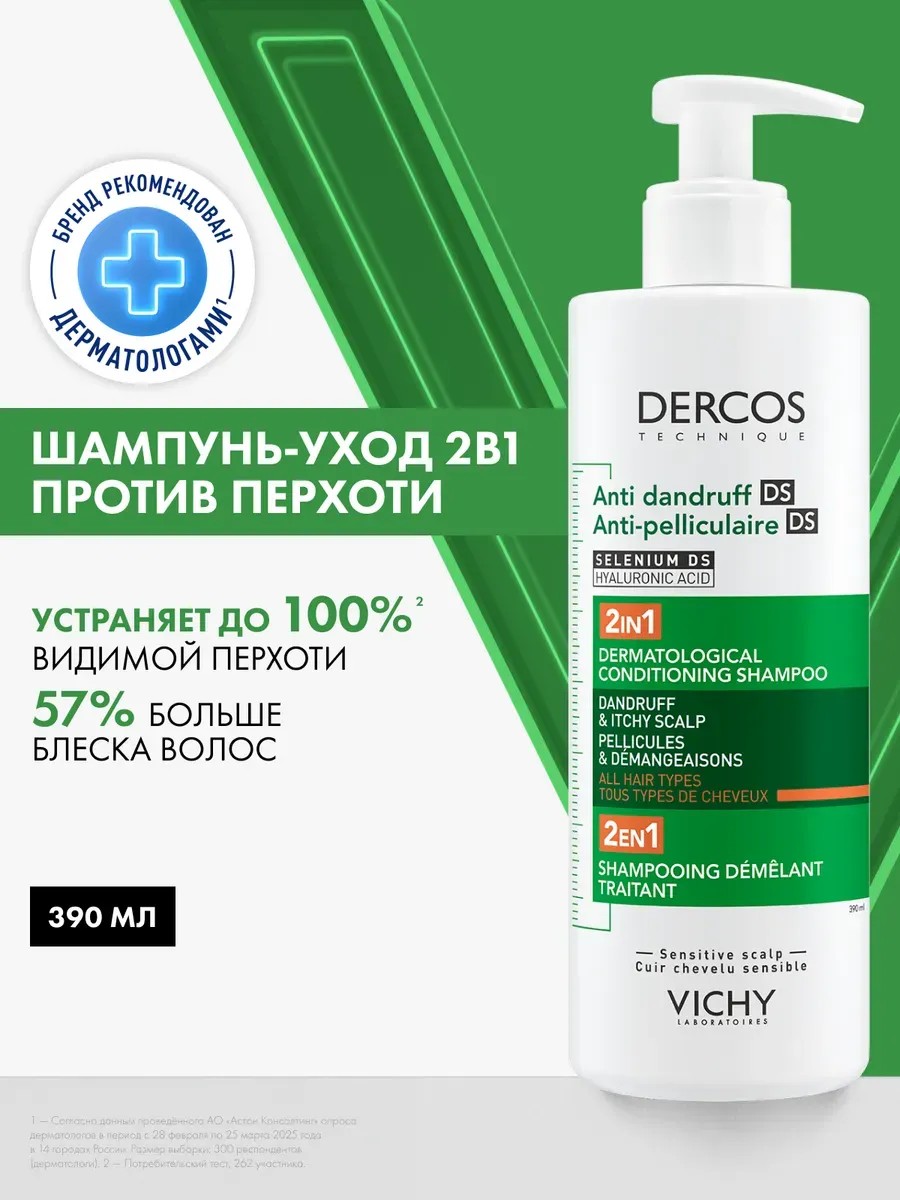 DERCOS Dry Hair Care Shampoo with Selenium DS – the most effective anti-dandruff ingredient. Restores the scalp's microbiome balance and barrier functions, relieves itching and prevents recurrence of dandruff. Active ingredients: Selenium DS – effectively reduces the growth and proliferation of Malassezia fungus, restores and normalizes the scalp microbiome. Ceramide P – improves the hair's barrier properties and its resistance to external factors. Salicylic acid – gently exfoliates dead skin cells. Vitamin E – a natural antioxidant, fights free radicals and has anti-inflammatory properties. Directions for use: Apply a small amount of shampoo to damp hair, massage, leave on for 2 minutes, and rinse with water. For dandruff control, use 2-3 times a week for 4 weeks. For prevention, use once a week. Efficiency: results after just one use – 100% visible dandruff elimination. Prevents dandruff recurrence for 6 weeks. Soothes the scalp, eliminating itching. Results are clinically proven, tested under dermatological supervision. Tested on consumers suffering from stress, fatigue, and living in big cities. * Vichy Dercos laboratories were the first to discover that dandruff is caused not only by the growth of Malassezia bacteria, but also by an imbalance in the entire scalp microbiome – a collection of microorganisms normally present on the skin. This imbalance is aggravated by factors such as an aggressive external environment, ecology, stress, and fatigue. Clinical test. You can also find this product by searching for: pharmacy care cosmetics; men's and women's strengthening shampoo for seborrhea and seborrheic dermatitis; French peeling, scrub for scalp with dandruff; Salicylic shampoo with a dispenser for men and women; anti-dandruff shampoo for adults;