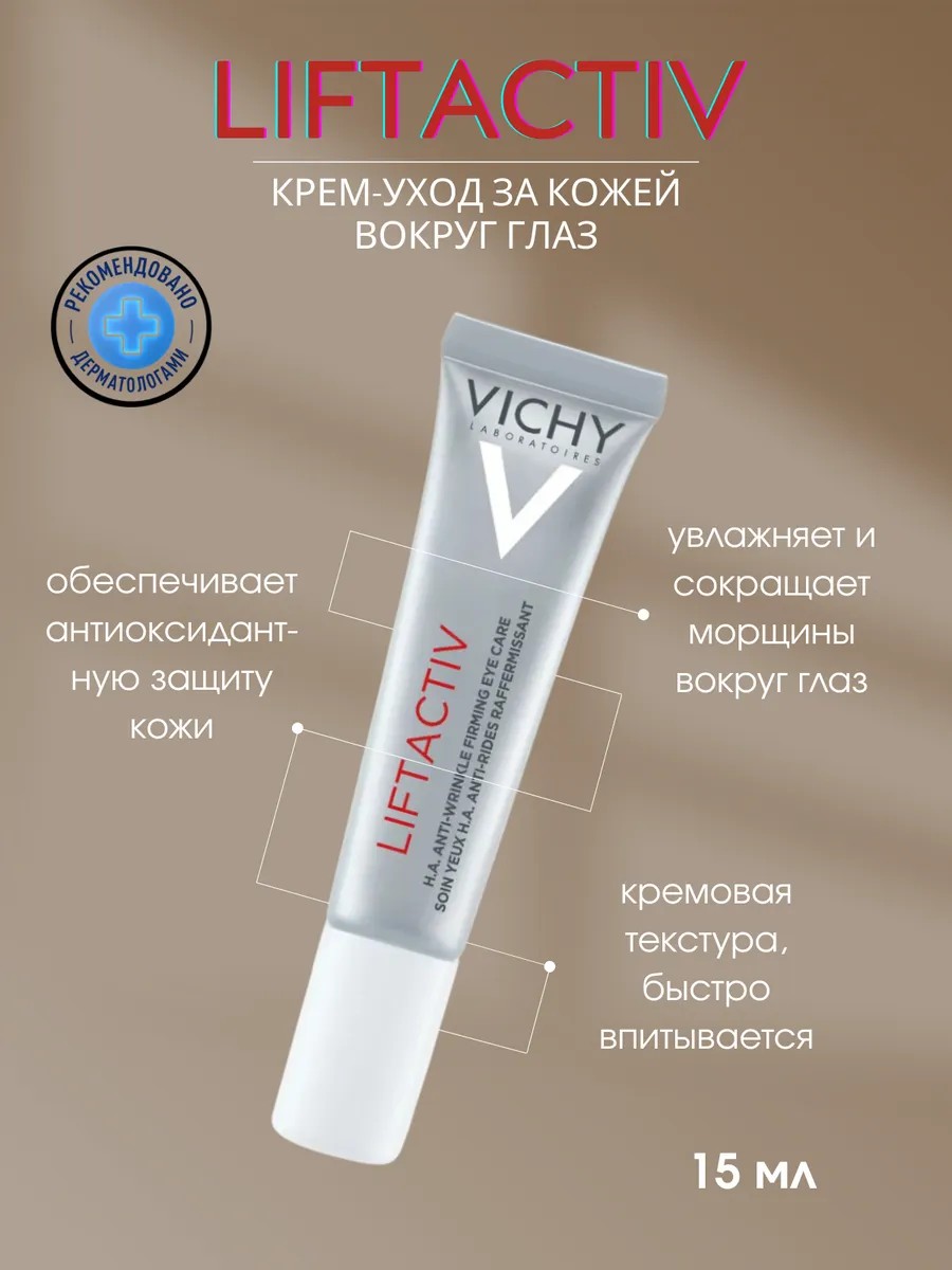 Крем для кожи вокруг глаз Liftactiv Supreme – инновация* от Vichy для коррекции морщин и темных кругов. Активные ингредиенты: чистая гиалуроновая кислота увлажняет и заметно подтягивает кожу. Кофеин помогает убрать отеки, тонизирует кожу контура глаз. Витамин C* [CG] обеспечивает антиоксидантную защиту кожи. Способ применения: наносите утром и вечером похлопывающими движениями на очищенную кожу вокруг глаз. Эффективность: мгновенно разглаживает кожу вокруг глаз. При ежедневном использовании морщины сокращаются, заметно уменьшаются темные круги и мешки под глазами, повышается упругость. Протестировано на чувствительной коже под дерматологическим и офтальмологическим контролем. *Среди продуктов Vichy. Может использоваться в качестве подарка: девушке; парню; брату; подруге; другу; жене; мужу; маме; папе; коллеге на 23 февраля; 8 марта; Новый год (НГ) или день рождения. Вы также можете найти данное средство по запросам: anti-age; анти-эйдж; антивозрастной уход для кожи век; французская аптечная косметика для женщин после 30-35 лет; лифтинг для лица и кожи вокруг глаз; уход от кругов, синяков и мешков под глазами; омолаживающий уход для лица; эмолент; дермокосметика для омоложения кожи; уход для взрослой женской кожи; витамин С для лица; гиалуронка (гиалурон) для лица; крем с кофеином для кожи вокруг глаз; пантенол для лица; эмолентное средство; уход для зрелой кожи лица; увлажняющий уход с лифтинговым эффектом для возрастной кожи. Liftactiv Supreme – Виши Лифтактив Супрем, 15 мл.