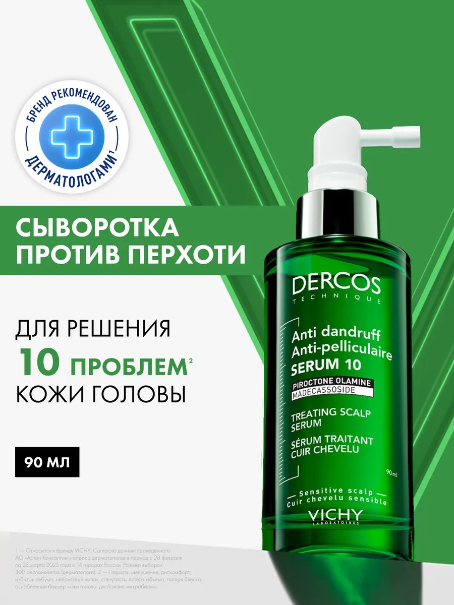 Vichy Dercos Anti-Dandruff Serum is an intensive hair serum that addresses 10 scalp concerns that may be associated with dandruff. Active ingredients: Piroctone olamine is an antimicrobial component that acts on the Malassezia fungus, helping to effectively combat dandruff. Madecassoside soothes and restores the scalp. 1% Vitamin Cg is an antioxidant that protects cells from damage by free radicals. Directions for use: Use 3 times a week for 4 weeks on damp or dry scalp. Divide hair into 4 sections and spray 5 times on each section. Massage into scalp. Do not rinse. For external use only. Avoid spraying in eyes or on irritated skin. In case of contact with eyes, rinse immediately and thoroughly with water. Efficiency: The serum effectively** fights dandruff and restores the scalp between shampoos. The formula is designed to combat: dandruff; flaking; discomfort; excess sebum; unpleasant odor; tightness; loss of volume; loss of shine; weakened scalp barrier; microbiome imbalance. Tested under dermatological control. *Among VICHY products. **Clinical study, 37 participants, after 4 weeks of use and 3 weeks of sustained effect. The product belongs to the categories: French pharmacy cosmetics for women and men, care cosmetics. Used against dandruff, itching, seborrhea and seborrheic dermatitis. Used as a leave-in hair serum-spray. Vichy Dercos - Vichy Dercos.