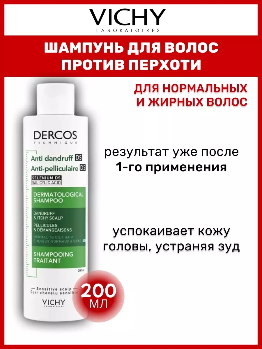 Vichy, Dercos Интенсивный шампунь-уход против перхоти для чувствительной кожи головы. Предназначен для борьбы с несовершенствами, с цветным и отрубевидным лишаем у женщин, мужчин и подростков от 14 лет.