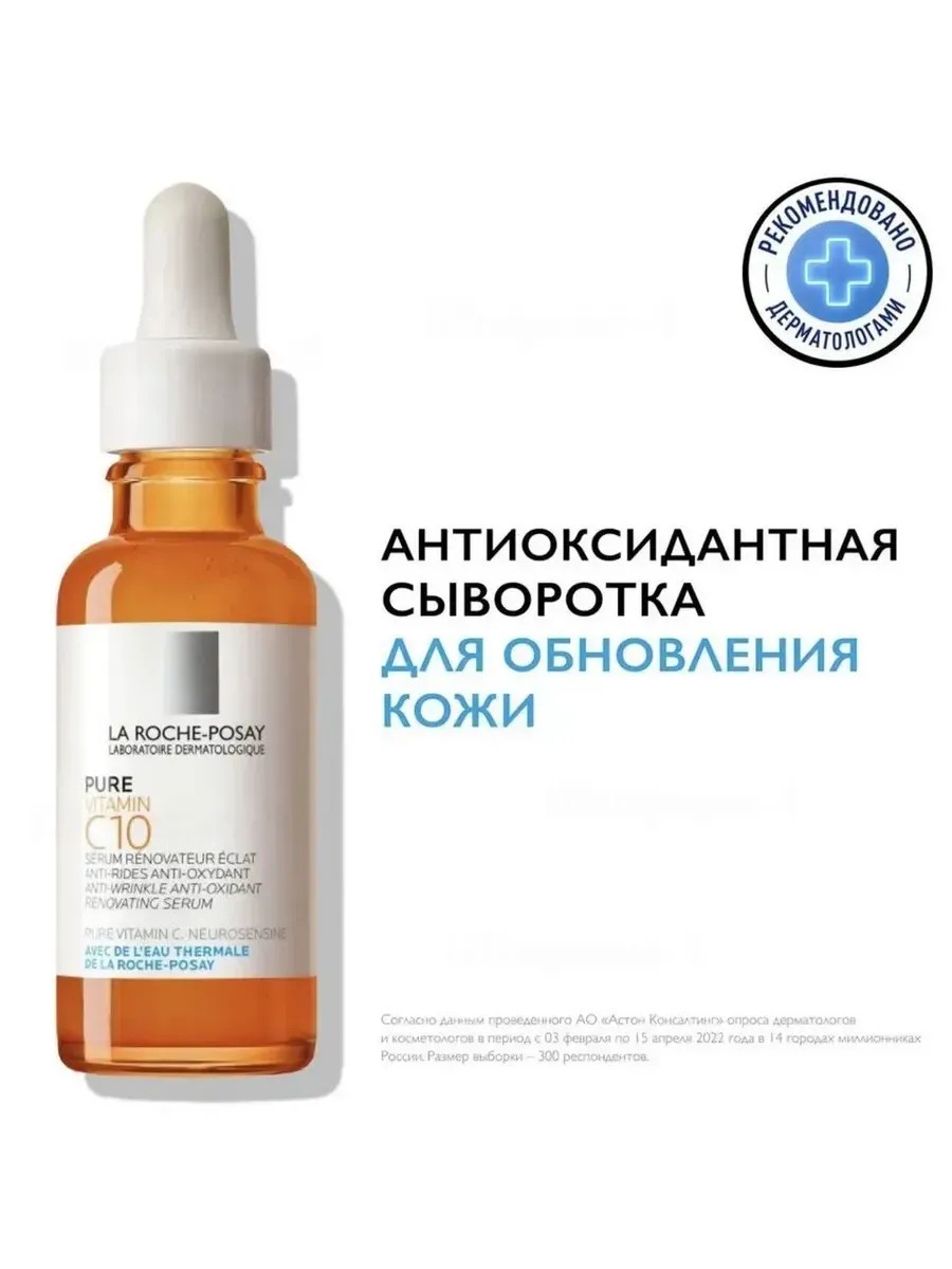 Антиоксидатная сыворотка для обновления кожи Vitamin C10 Serum сокращает морщины, возвращает лицу сияние и обеспечивает заметный выравнивающий эффект.АКТИВНЫЕ ИНГРЕДИЕНТЫ-Чистый витамин С (концентрация 10%) – мощный антиоксидант, предотвращает появление признаков старения кожи, стимулирует выработку коллагена, улучшает цвет лица.-Термальная вода La Roche-Posay (Франция) улучшает антиоксидантную защиту кожи, обеспечивает смягчающий и увлажняющий эффект.-Салициловая кислота – обладает отшелушивающими свойствами, способствует выравниванию микрорельефа и тона кожи.-Нейросенин успокаивает кожу, придает ей чувство комфорта, снижает чувствительность и реактивность.-Гиалуроновая кислота глубоко увлажняет кожу.ЭФФЕКТИВНОСТЬ-Мгновенно увлажняет и смягчает кожу.-Визуально сокращает поверхностные и глубокие морщины, придает коже сияние.-Выравнивает поверхность и тон кожи.-Цвет лица становится здоровым и сияющим.Vitamin C10 Serum протестирован на чувствительной коже. Имеет физиологический pH. Подходит в качестве базы под макияж.