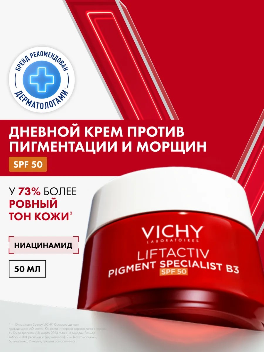 VICHY LIFTACTIV Дневной крем с витамином В3 против пигментации SPF50 — инновационный продукт, который не только снижает видимость пигментных пятен, но и обеспечивает надежную защиту от вредных солнечных лучей.