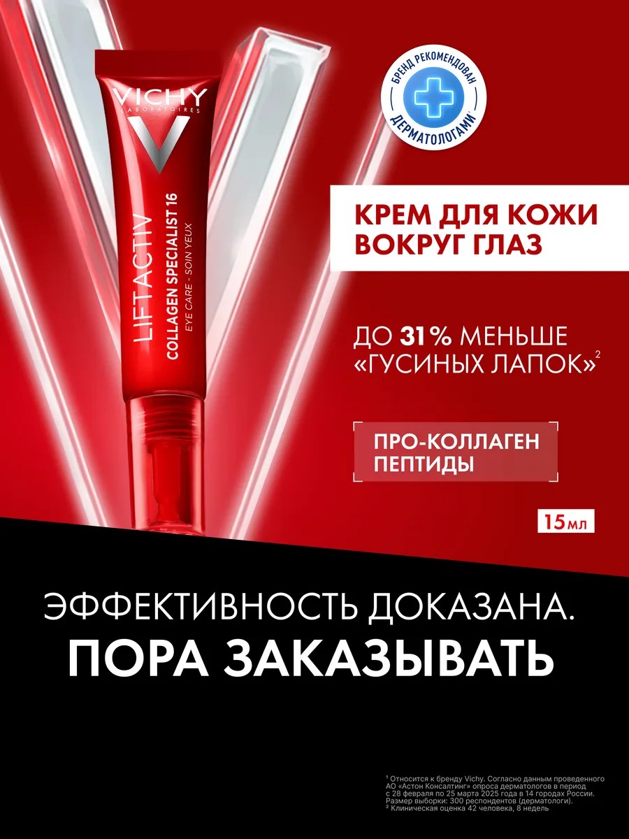 Реновация от Vichy: Liftactiv Collagen 16 высокоэффективный крем для молодости кожи вокруг глаз с про-коллаген пептидами. Активирует 16 признаков молодости. Co-Bonding* технология с про-коллаген пептидами стимулирует и укрепляет различные типы коллагена кожи: в 4 раза больше коллагена.