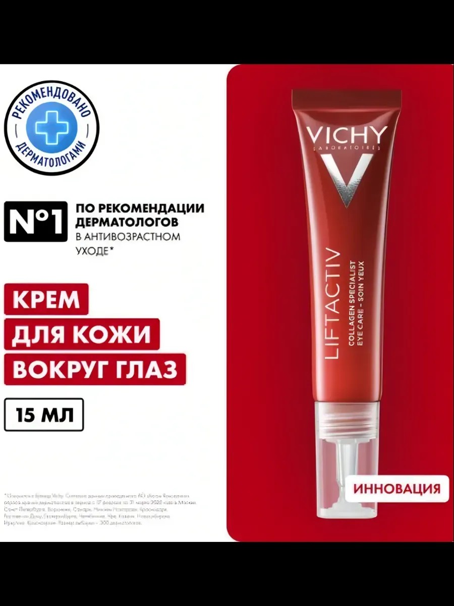 С возрастом в коже снижается синтез коллагена. Нежная кожа вокруг глаз – это область, где видимые признаки потери коллагена проявляются в первую очередь. Инновация* от VICHY: Новый крем для кожи вокруг глаз с уникальным комплексом Про-Коллаген [Пептиды + Проксилан + витамин Cg], увеличивает синтез коллагена для воздействия на 5 признаков старения кожи– «гусиные лапки», морщины, мешки под глазами, темные круги, нависшее веко (птоз). * Среди продуктов VICHY.