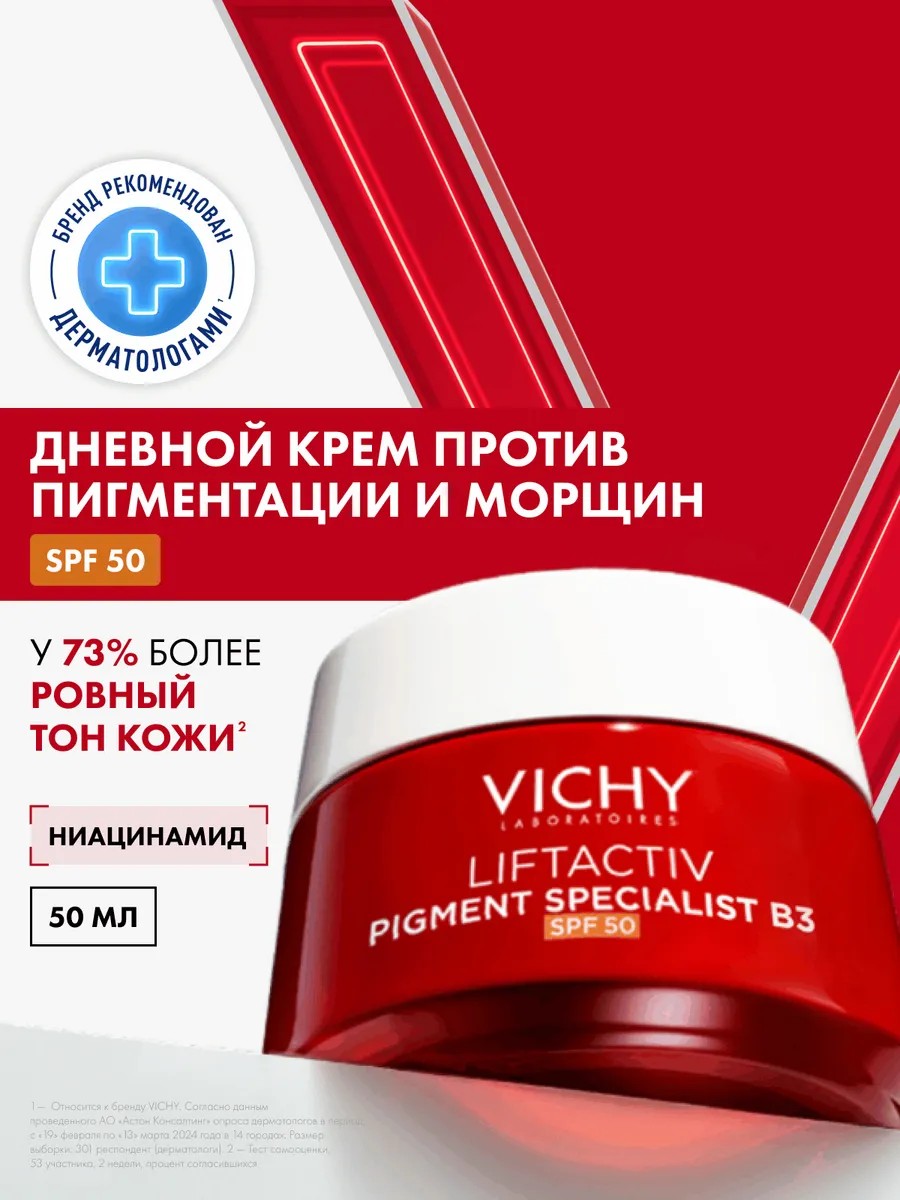 Инновация** от VICHY – новый дневной крем LIFTACTIV с витамином B3 против пигментации SPF 50. Улучшенный эффективный антивозрастной уход с ниацинамидом (витамин B3) и пептидами в сочетании с фильтром широкого спектра SPF 50.