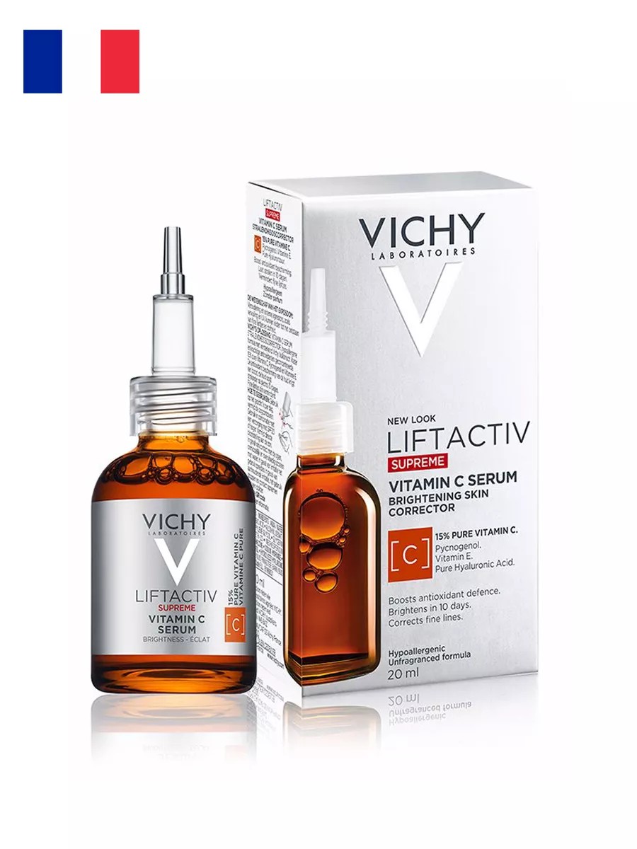 Your skin deserves only the best care, and we know how to help it! Introducing VICHY LIFTACTIV SUPREME Vitamin C Facial Serum—a true gift from France for your skin. This concentrated serum is enriched with vitamin C, a powerful antioxidant that will help your skin fight wrinkles, fatigue, and puffiness. Thanks to its unique formula with volcanic water, pycnogenol, and vitamin E, the serum enhances the skin's antioxidant defenses, imparts radiance, and smoothes wrinkles after just 10 days of use. The serum's weightless texture absorbs quickly without leaving a sticky or greasy feeling. Recyclable packaging with a precision applicator makes this product even more convenient and hygienic to use. Active ingredients in the serum, such as hyaluronic acid, vitamin E, pycnogenol, and 15% vitamin C, work synergistically to give your skin firmness, protection from oxidative stress, radiance, and an even tone. Free of dyes and fragrances, this serum is ideal for all skin types aged 30 and up. Apply 2-3 drops to cleansed skin, avoiding the eye area, and be sure to follow with a product with SPF > 20. Trust French cosmetics and give your skin the best care with VICHY LIFTACTIV SUPREME Vitamin C Facial Serum.