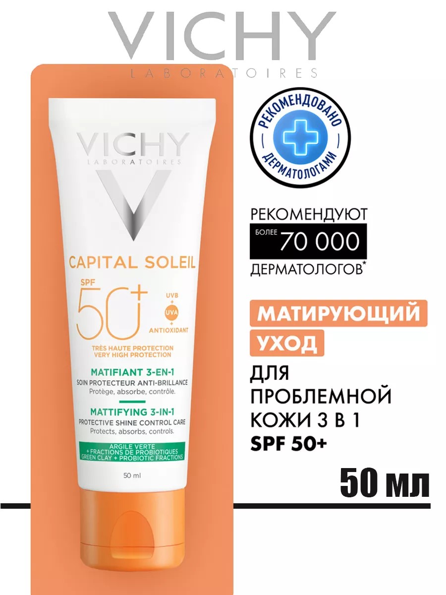 VICHY Capital Soleil 3-in-1 Mattifying Care for Oily Skin SPF50+ 50ml. Daily care for oily, problematic skin with a complex of broad-spectrum sunscreens provides reliable protection from UV rays. The formula with green clay controls shine by absorbing excess sebum. The probiotic BIFIDUS in the formula maintains the integrity of the skin barrier, natural vitamin E protects against oxidative stress, and VICHY Volcanic Thermal Water, with its restorative and strengthening properties, strengthens the skin's protective barrier. Apply sunscreen to skin immediately before sun exposure. To maintain protection, reapply regularly and generously, especially after swimming, intense sweating, or toweling off. Avoid prolonged sun exposure, even when using sunscreen, as no sunscreen can provide 100% protection. Avoid the eye area. In case of contact with eyes, rinse immediately and thoroughly with water. Avoid contact with clothing. Ingredients: UV filter system, green clay, shine control technology, BIFIDUS probiotic, vitamin E, Vichy volcanic thermal water.