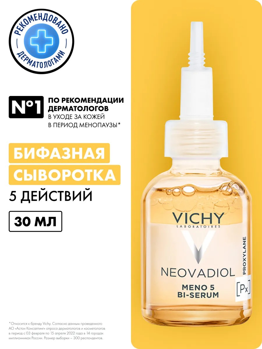 VICHY Innovation: Biphasic Menopausal Serum Neovadiol, which effectively works in 5 directions: visibly improves elasticity and evens out skin tone, smoothes wrinkles, remodels facial contours, and nourishes the skin. Active ingredients: VICHY Laboratory combined VICHY Volcanic Water with Proxylane, Vitamins B3-C-E2, Omega 6-9, and Cassia Extract. Directions: Apply twice daily before using cream. Before sun exposure, it is recommended to apply a sunscreen with SPF over the serum. Effectiveness: visibly improves skin elasticity, evens out skin tone, and smooths out wrinkles.