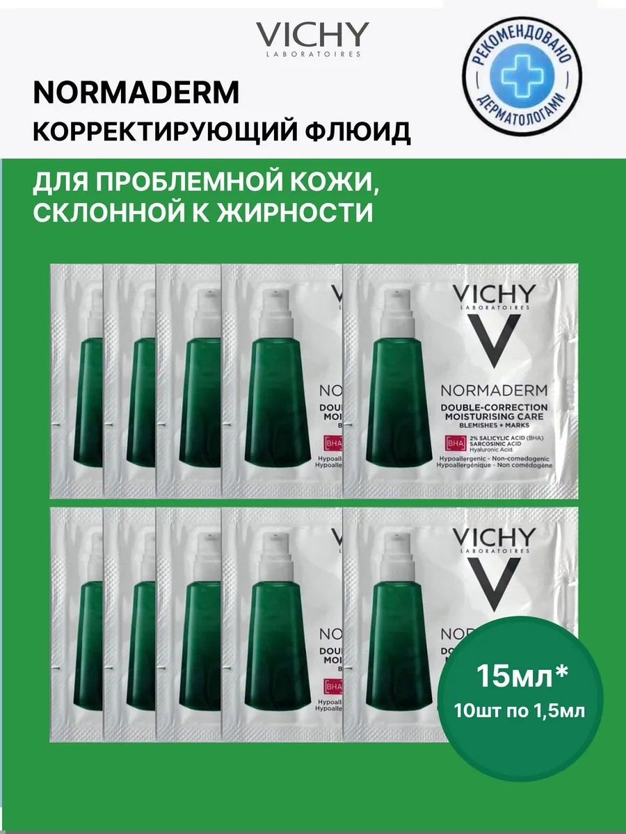 Корректирующий флюид с противовоспалительным действием для проблемной кожи, склонной к жирности. Представлен в формате саше, в наборе 10шт по 1,5мл (общий объем 15мл).