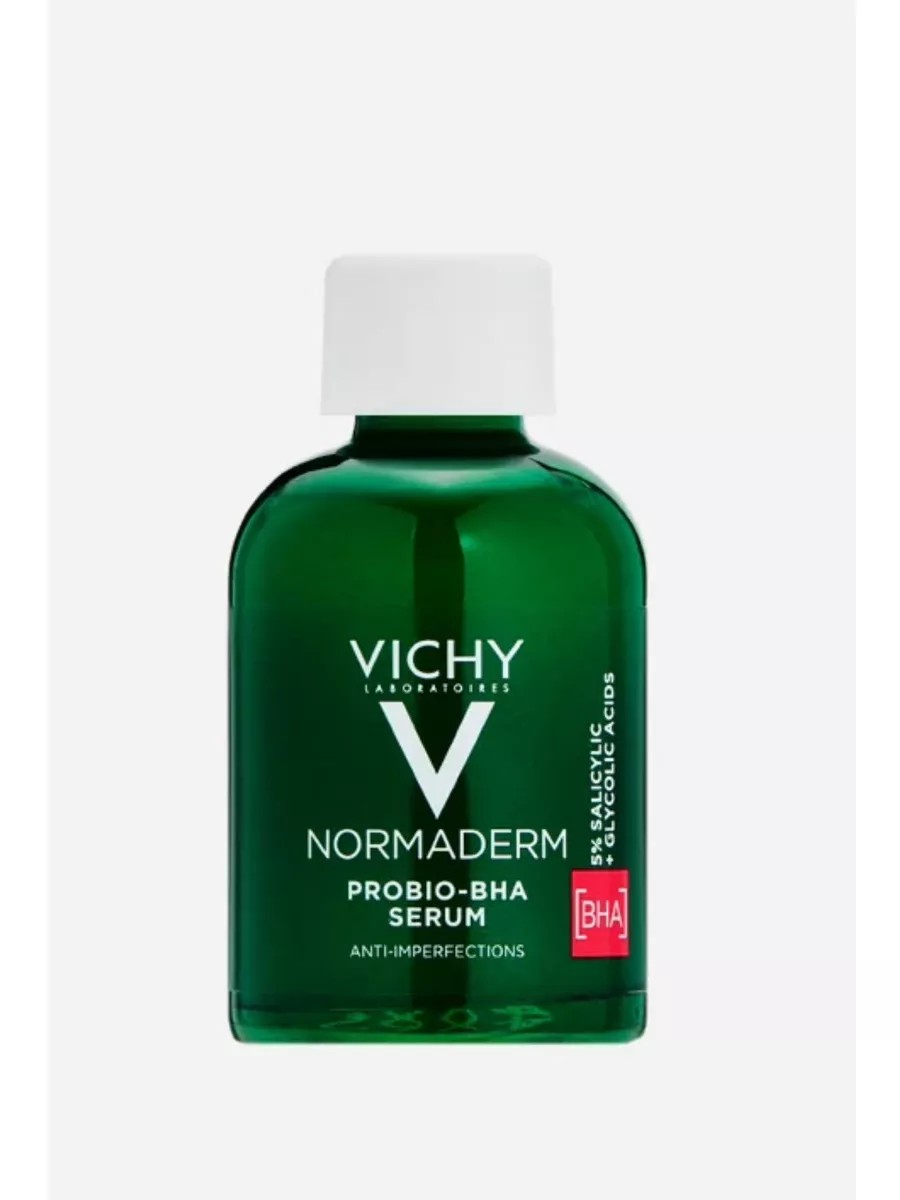 Normaderm Probio-BHA Serum, a probiotic renewing serum from Vichy, is specially formulated for acne-prone skin and targets imperfections. It corrects signs of problem skin: blackheads, post-acne scars, and enlarged pores. ACTIVE INGREDIENTS: Salicylic acid (BHA), thanks to its lipid-soluble structure, penetrates deep into pores, cleanses them, and eliminates blackheads, preventing the formation of new breakouts. Glycolic acid (AHA) exfoliates the skin and accelerates its renewal process, effectively reducing spots and traces of skin imperfections. Probiotics have a positive effect on the skin, enhancing its regeneration and helping it better tolerate acidic conditions. Vichy volcanic water enhances its protective function. Vitamin C evens out skin tone. Hepes accelerates metabolic processes in the dermo-epidermal junction, smoothing the skin's microrelief. HOW TO USE: Gently squeeze the middle part of the applicator and squeeze a few drops onto your fingertips. Apply to dry, cleansed skin, avoiding the eye area. Use once a day in the evening, and during the day use UV protection with SPF 20 or higher. If skin irritation occurs, increase the intervals between uses. Suitable for daily use. EFFECTIVENESS: -52% skin imperfections*; -66% post-acne in the form of red spots*; -27% blackheads and comedones*; -57% skin oiliness*; +54% smooth skin texture. Hypoallergenic. High-tech packaging with an applicator for precise dosing. Can be used as a gift for a girlfriend, boyfriend, brother, girlfriend, boyfriend, wife, husband, colleague, mom, dad for February 23rd, March 8th, New Year (NG) or birthday. * Clinical evaluation test, 14 participants, 6 weeks. ** Consumer test, 100% of respondents found the product to be quickly absorbed.