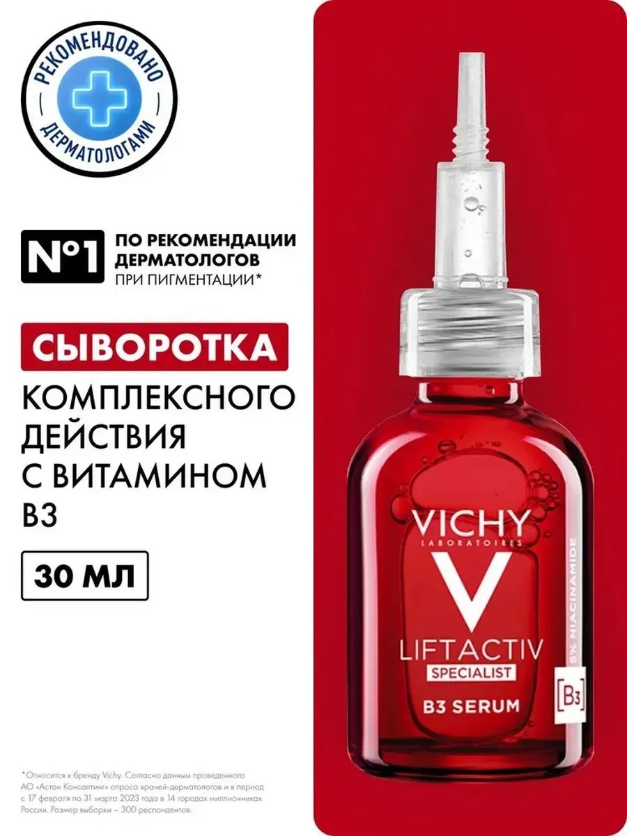 Evens skin tone and adds radiance. VICHY INNOVATION: A COMPREHENSIVE ACTION SERUM WITH VITAMIN B3 AGAINST PIGMENTATION AND WRINKLES.