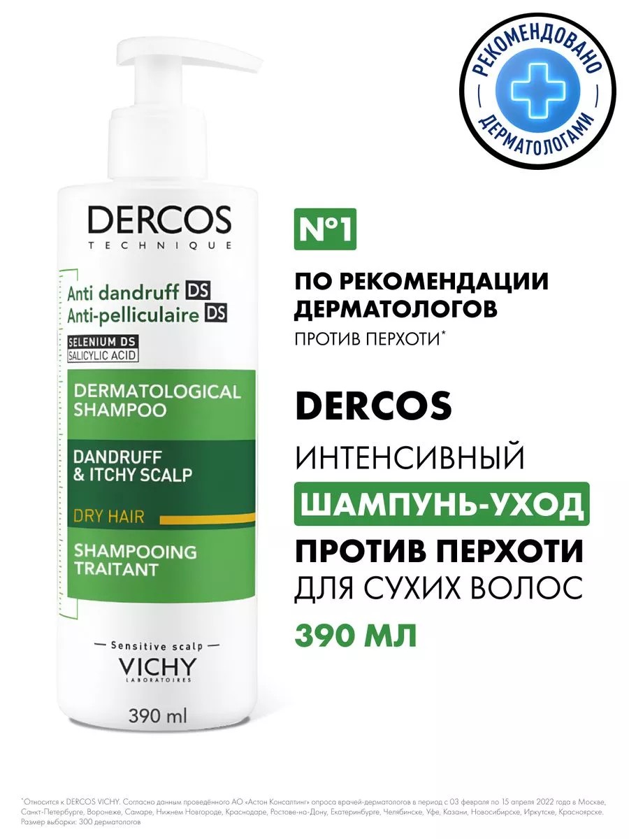 Шампунь-уход для сухих волос DERCOS с Селеном DS – самым эффективным ингредиентом против перхоти. Восстанавливает микробиомный баланс кожи головы и барьерные функции, устраняет зуд и предотвращает повторное появление перхоти. АКТИВНЫЕ ИНГРЕДИЕНТЫ: селен DS – эффективно снижает рост и размножение грибка Malassezia, обеспечивает восстановление и нормализует микробиом кожи головы. Керамид Р – повышает барьерные свойства волос и их устойчивость к воздействию внешних факторов. Салициловая кислота – мягко отшелушивает ороговевшие клетки кожи головы. Витамин Е – естественный антиоксидант, борется с действием свободных радикалов и обладает противовоспалительными свойствами. СПОСОБ ПРИМЕНЕНИЯ: нанесите небольшое количество шампуня на влажные волосы, помассируйте, оставьте на 2 минуты, смойте водой. Курс применения для устранения перхоти: 2-3 раза в неделю в течение 4 недель. Для профилактики: использовать 1 раз в неделю. ЭФФЕКТИВНОСТЬ: результат уже после 1-го применения – устранение 100% видимой перхоти. Предотвращение повторного появления перхоти в течение 6 недель. Успокаивает кожу головы, устраняя зуд. Результаты доказаны клинически, протестирован под контролем дерматологов. Протестированное действие на потребителях, страдающих от стресса, усталости, проживающих в больших городах. * Впервые лаборатории Vichy Dercos выявили, что причина появления перхоти не только рост бактерии Malassezia, но и дисбаланс всего микробиома кожи головы – совокупность микроорганизмов, в норме присутствующих на коже. Этот дисбаланс усиливается под воздействием таких факторов, как агрессивная внешняя среда, экология, стресс, усталость. Клинический тест. Вы также можете найти данное средство по запросам: аптечная уходовая косметика; мужской и женский укрепляющий шампунь от себореи и себорейного дерматита; французский пилинг, скраб для кожи головы с перхотью; салициловый шампунь с дозатором для мужчин и женщин; шампунь от перхоти для взрослых;