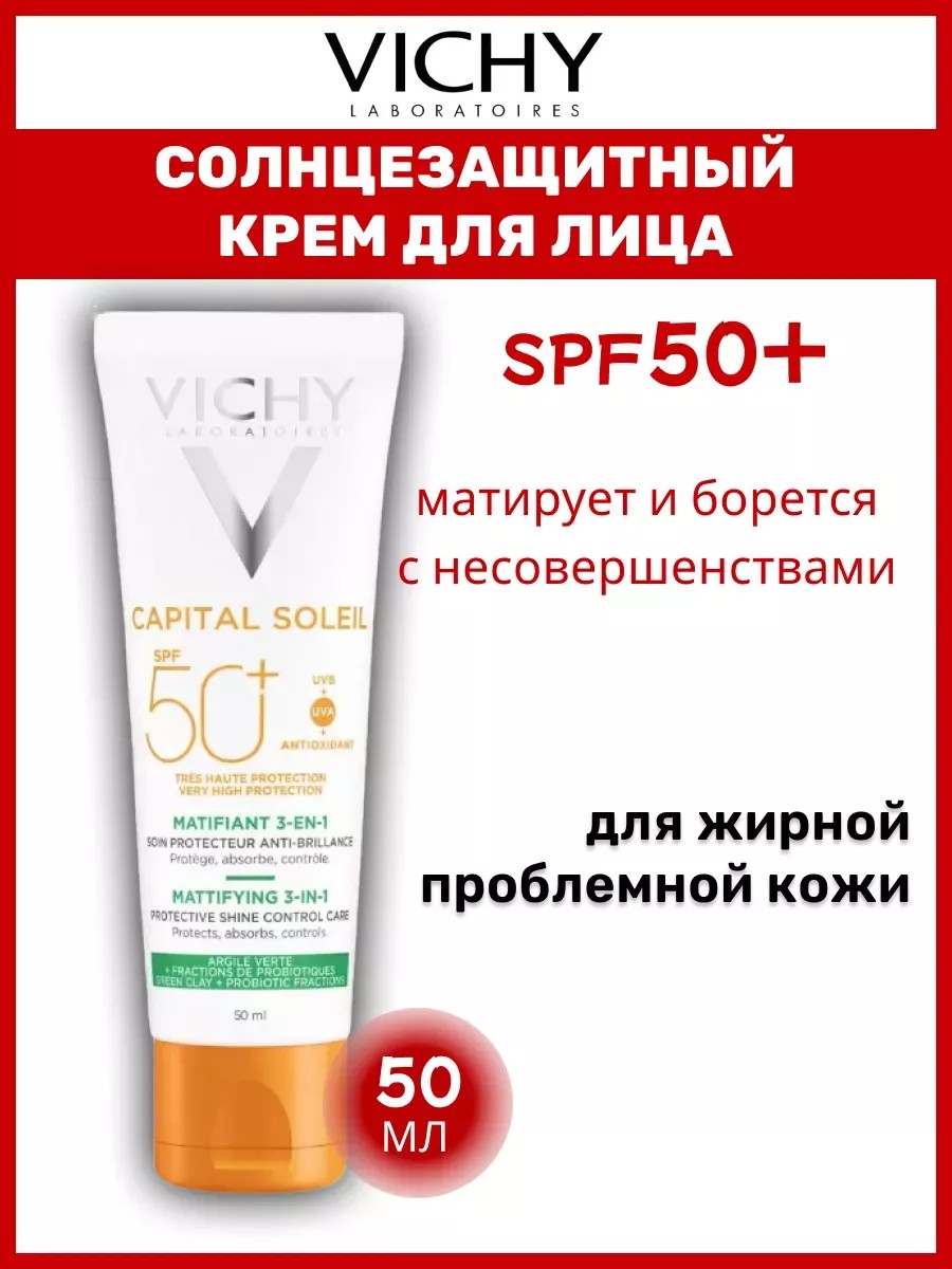 VICHY Capital Soleil Уход солнцезащитный матирующий SPF 50+ 3-в-1 для проблемной кожи 50 мл - ежедневный уход для жирной проблемной кожи с комплексом солнцезащитных фильтров широкого спектра действия надежно защищает от UV-лучей. Формула с зеленой глиной контролирует жирный блеск, абсорбируя избыток кожного себума. Пробиотик BIFIDUS в составе формулы поддерживает целостность кожного барьера, витамин Е натурального происхождения защищает от оксидативного стресса, а Вулканическая термальная вода VICHY, обладающая восстанавливающими и укрепляющими свойствами, усиливает защитный барьер кожи. 365 дней в году наша кожа подвержена UV-излучению. Под его влиянием нарушается защитный барьер, что усугубляет состояние жирной проблемной кожи. Ультрафиолет провоцирует утолщение рогового слоя кожи и более активную выработку себума, что может привести к гиперкератинизации и последующему формированию на коже несовершенств - открытых и закрытых комедонов, воспалительных элементов, расширенных пор.