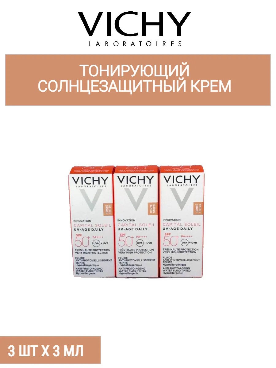 CAPITAL SOLEIL UV-AGE DAILY Weightless Sunscreen Fluid for the Face Against Signs of Photoaging Tinted Light SPF 50+, 3 ml. ACTIVE INGREDIENTS: The formula, enhanced with VICHY Volcanic Thermal Water, Probiotic Fraction, Peptide, and Niacinamide, protects against pigmentation, premature wrinkles, and decreased skin elasticity. Mineral pigments in the formula provide an even tone, without shine or a sticky feeling. Patented NETLOCK technology creates weightless and invisible protection on the skin's surface. The light, non-sticky texture of the fluid is not felt on the skin and is sweat-resistant. HOW TO USE: Apply every morning over your basic skincare routine. RESULT: Fights pigmentation and wrinkles. Protects against negative environmental factors. Provides an even tone, without shine or a sticky feeling.