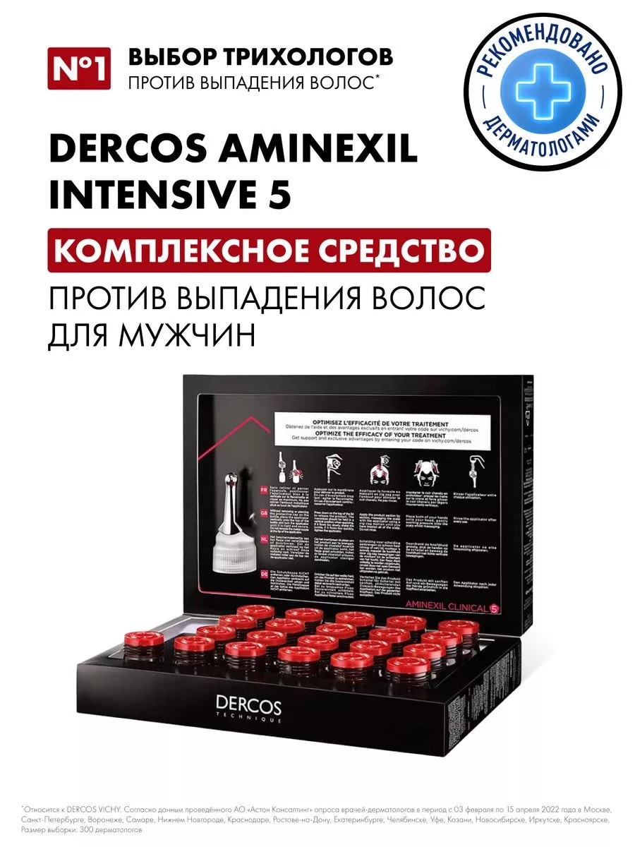 Vichy Dercos Aminexil Intensive 5 Комплексное средство против выпадения волос для мужчин в ампулах с аминексилом, аргинином, витаминами для густоты и роста волос, 21 монодоза. Действует на корни волос, кожу головы и волокно волоса, помогая эффективно бороться с облысением. Активная формула с 1,5% аминексила усиливает фиксацию волос в кожном покрове головы и служит профилактикой алопеции, в т.ч. возрастной. Аргинин (arginine) стимулирует микроциркуляцию, улучшает питание волосяных луковиц, способствует усилению и ускорению роста волос. Комплекс Пироктон Оламин + Витамин Е обладает противомикробными и успокаивающими свойствами. Минерализующая термальная вода Vichy повышает защиту от негативных внешних факторов, обеспечивает интенсивное увлажняющее и укрепляющее действие. SP94 питает волосы от самых корней, способствует их восстановлению и укреплению, а также активации и стимуляции роста. Витамины РР/В6 насыщают волосы необходимыми питательными веществами. Формула разработана с учетом особенностей мужской кожи головы. Предусмотрено 2 способа применения ампульного ухода Aminexil Intensive 5. 1. Умеренное выпадение: применять по 3 монодозы в неделю в течение 6 недель минимум. 2. Интенсивное выпадение: одна монодоза в день в течение 6 недель минимум. Aminexil Intensive 5 необходимо наносить равномерно по проборам на чистые сухие или влажные волосы утром или вечером. Мультикомпонентная формула, стимулирующая усиленный рост волос, замедляет облысение, обладает уплотняющими и восстанавливающими свойствами, возвращая красоту и густоту волос. Эффективность доказана мужчинами (применение в течение 6 недель): выпадение волос после душа сокращается на 91%, в течение дня – на 89%. Не содержит парабенов, обладает оптимальной переносимостью. Может использоваться в качестве подарка парню, брату, другу, мужу, коллеге, папе на 23 февраля, Новый год (НГ) или день рождения. Вы также можете найти данное средство по запросам: косметический бустер для стимулирования роста волос;