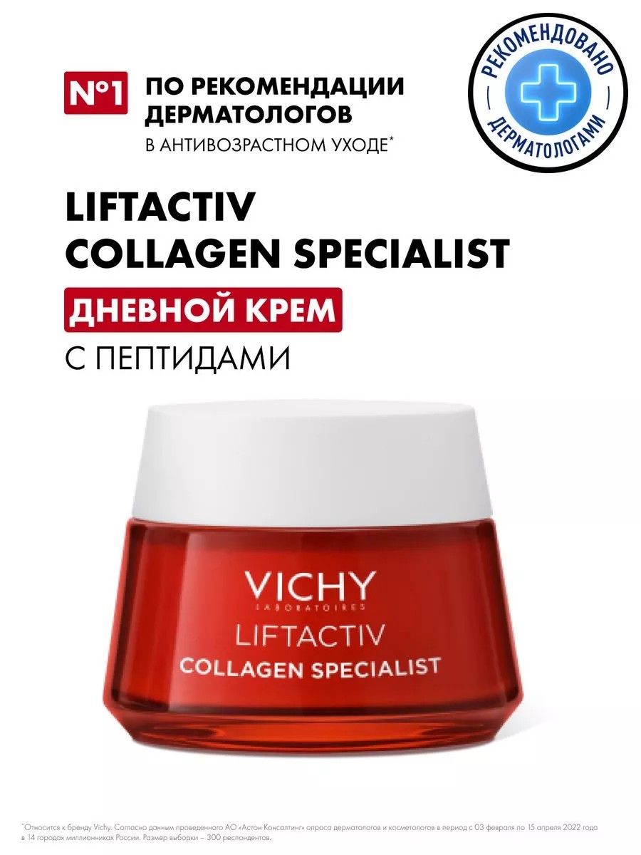 Антивозрастной дневной крем для лица Vichy Liftactiv Collagen Specialist (Франция) стимулирует ресурсы кожи противостоять старению, активируя нормальную выработку коллагена. Сочетание активных компонентов натурального происхождения обеспечивает омолаживающее, корректирующее, разглаживающее морщины и лифтинговое действие, восстанавливает упругость коллагенового каркаса, свежесть и красоту кожи. Аптечная косметика для лица Vichy Liftactiv Collagen Specialist предназначена для увлажнения и anti-age (анти-эйдж) ухода за зрелой женской кожей в 35, 40, 45, 50 плюс, но может быть рекомендована и в 25-30 в зависимости от выраженности возрастных изменений, а также состояния и потребностей кожи. Активные ингредиенты: натуральные био-пептиды 1 и 2 типа стимулируют синтез коллагена и обеспечивают разглаживание морщин с эффектом лифтинга; эперулин снижает гиперчувствительность, обладает противовоспалительным, успокаивающим действием. Эффективность: после первого применения тонус кожи увеличивается на 52%, отмечается увлажняющий эффект. Через 4 недели морщины сокращаются на 16% (на лбу - на 8%), носогубные складки уменьшаются на 11%, овал лица приобретает четкость. Через 2 месяца морщины сокращаются на 26%, контуры лица и линия подбородка выглядят более четкими, пигментация становится менее выраженной. Способ применения: наносите крем-эмолент на очищенную кожу лица, шеи и зоны декольте утром и/или вечером, дополняя им привычный ритуал дневного или вечернего ухода. Можно сочетать с другой антивозрастной косметикой от мимических морщин, носогубных складок (масками, кремами и т.д.). Гипоаллергенная формула Liftactiv Collagen Specialist протестирована под контролем дерматологов и рекомендована для ухода за любым типом кожи, включая чувствительную. Подходит в качестве подарка маме, бабушке, жене, учителю, подруге, коллеге на 8 марта, День учителя, Новый год (НГ) или день рождения. Vichy Liftactiv Collagen Specialist - Виши Лифтактив Коллаген Специалист.