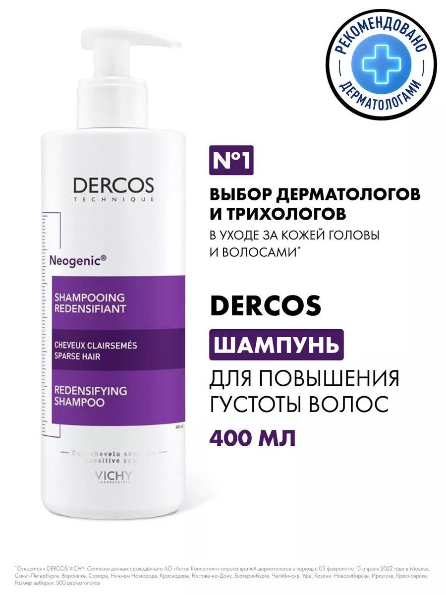 Vichy Dercos Neogenic Шампунь для повышения густоты, объема, блеска и плотности волос, со стемокседином, 200 мл. Бережно очищает и улучшает качество волос по 5 параметрам: объем, густота, плотность, блеск, сила. Запатентованная молекула стемоксидин пробуждает спящие волосяные луковицы, стимулирует рост и увеличение густоты волос. Уплотняющая технология оказывает комплексное воздействие, способствуя интенсивному укреплению и уплотнению ослабленных, истонченных волос. Термальная вода Vichy обеспечивает восстановление нормального pH кожи головы, оказывает интенсивное увлажняющее и укрепляющее действие. Способ применения: нанесите небольшое количество шампуня на влажные волосы, помассируйте, оставьте на 2 минуты, смойте водой. Обеспечивает повышение густоты волос, придание им блеска и силы от корней до кончиков. Уплотняет даже тонкие, слабые волосы, не утяжеляя их. Придает мгновенный и продолжительный объем, делает волосы мягкими, густыми и плотными. Шампунь Dercos Neogenic упакован во флакон с дозатором объемом 400 мл. Без парабенов. Подходит для частого использования, в т.ч. на чувствительной коже головы. Может использоваться в качестве подарка девушке, парню, брату, подруге, другу, жене, мужу, коллеге, маме, папе на 23 февраля, 8 марта, Новый год (НГ). * Вы также сможете найти данное средство по запросам: уходовая аптечная косметика из Франции для женщин и мужчин; все для домашнего ухода за женскими и мужскими волосами; французская дермокосметика для кожи головы жирного, сухого, нормального и комбинированного (смешанного) типов; купить товары для утолщения и гладкости волос, склонных к жирности; прозрачный косметический уплотнитель для очень пористых волос, создающий объем; утолщающий комплекс для волос; профессиональный шампунь для волос; тонизирующий шампунь для волос, шампунь для объёма.