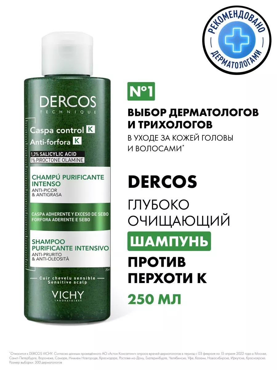 Dercos K Deeply Cleansing Peeling Shampoo for Hair against Dandruff, Seborrhea, and Itching with Salicylic Acid and Niacinamide for Exfoliation and Scalp Oil Reduction, 250 ml. Specially formulated to combat stubborn dandruff and excessively oily scalp. Reduces itching and flaking. Salicylic acid promotes gentle exfoliation of dead skin cells. Glycerin softens and moisturizes the skin. Niacinamide provides an intense soothing and caring effect. Piroctone Olamine inhibits the growth of Malassezia fungus and helps restore microbiome balance. Apricot kernel microparticles act as a scrub, ensuring the skin is cleansed of stubborn crusts. The effectiveness of dandruff correction is confirmed by 100% of consumers*. Results are visible after just one week of use. Clinically proven**. 94% reduces scalp itching. 65% reduces scalp oiliness. Thanks to an effective combination of chemical and mechanical peeling, it is also used to add root volume. How to use: apply a small amount of peeling shampoo to damp scalp, lather, leave for 3 minutes, then rinse with water. With regular use, it strengthens the hair fiber from roots to tips, providing volume and vitality. The hypoallergenic formula has a physiological pH of 5.5, does not contain silicones and parabens. Suitable for sensitive scalp. Can be used as a gift for a girlfriend, boyfriend, brother, girlfriend, friend, wife, husband, colleague, mom, dad for February 23, March 8, New Year (NG). You can also find this product by searching for: exfoliating and antifungal shampoo against seborrhea and seborrheic dermatitis; to combat flaking and itching;