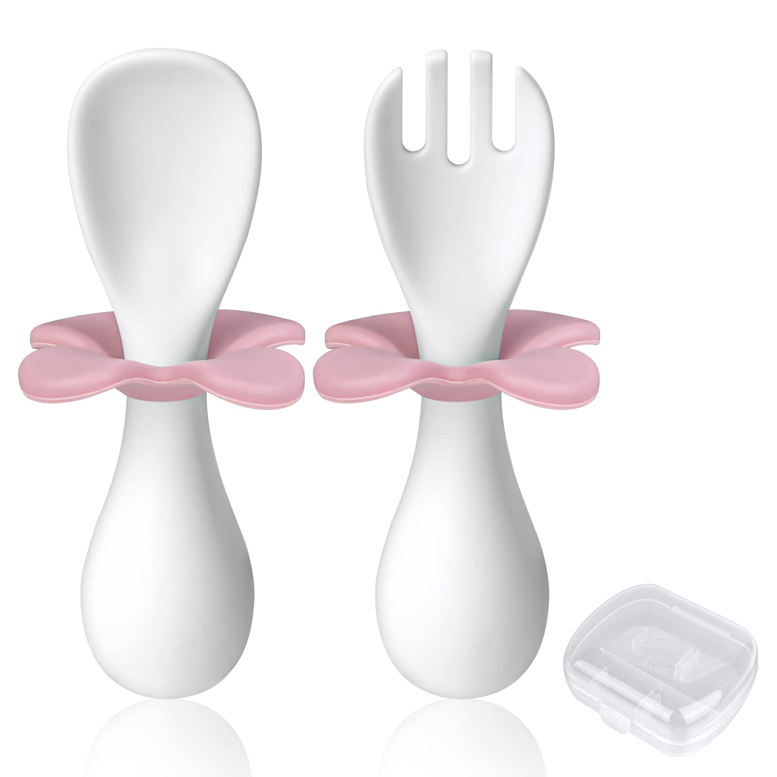 Vicloon Baby Fork and Spoon Infant Self Baby Spoon Fork Self Feeding Utensil Set Baby Cutlery Feeding Set Toddler Utensils Spoons Forks for Kids Self Feeding(White Flowers)