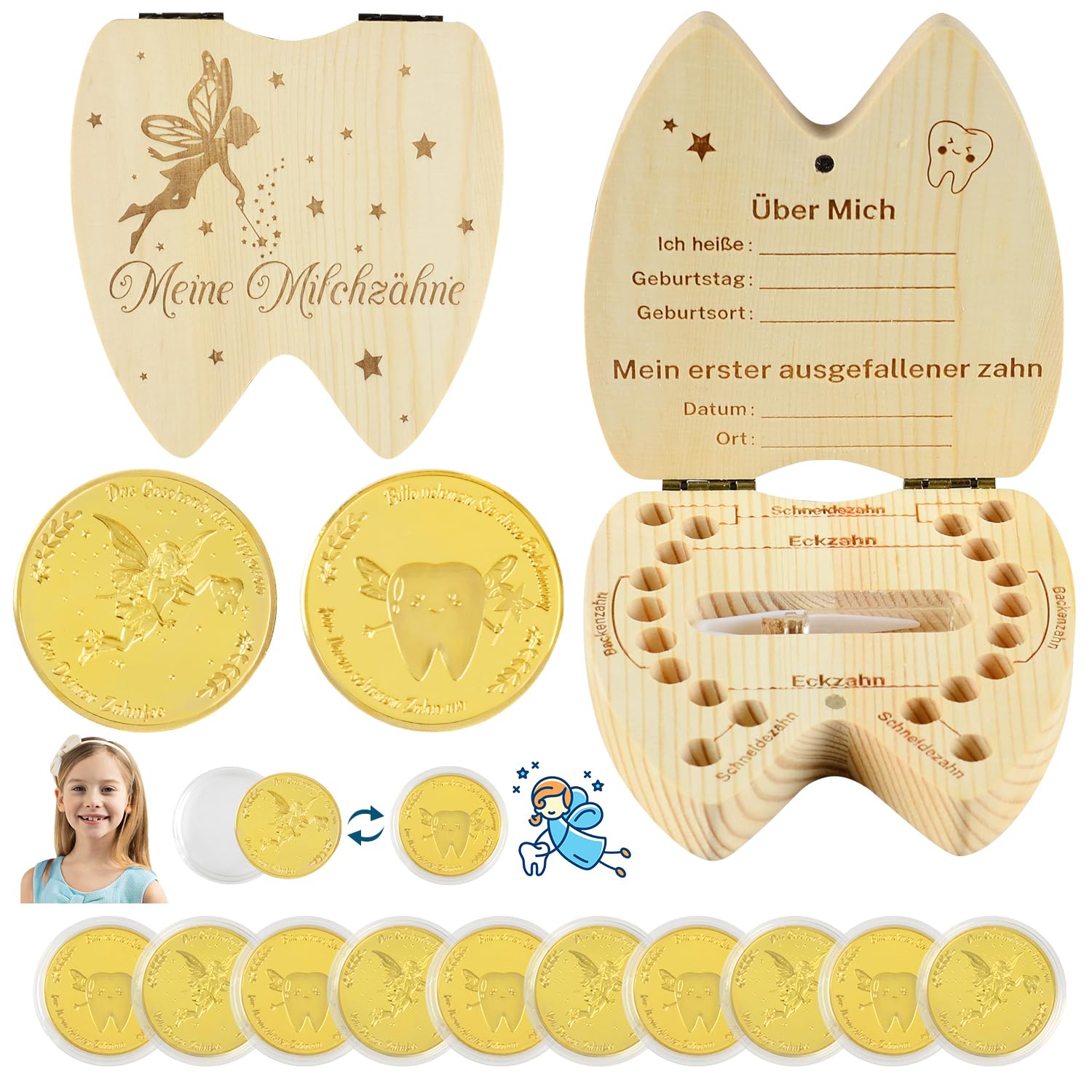 ?? gift from the tooth fairy contains: 10x tooth fairy coin, 1x milk tooth box, 1x tweezers, 1x bottle.Store milk teeth in a tooth box and give your brave child tooth fairy coins.In the event of dissatisfaction, contact us for reimbursement/exchange.?????Thentician tip: storage has sentimental value.Before storing the milk tooth, please sterilize it in boiling water for about 5 minutes, let it dry and then store it in a locked milk tooth box.??hohe quality: Each tooth fairy coin has an exquisite design of the tooth fairy on the front and back.These coins are made from a zinking and are not susceptible to fading or breaking.Each coin is packed in a separate plastic box so that children can easily store the coins.?? Tooth socket milk teeth: the milk tooth jar has separate compartments for molars, corner teeth and incisors, as well as space for personal information.A special gift to capture this time and to remember them later.????? idea from the stories of the tooth fairy: When children lost a milk tooth, they put it under their pillows.At night the tooth fairy came flew quietly, took the tooth and left a small tooth fairy coins.??GESCHENK VON DER ZAHNFEE:Set enthält :10x Zahnfee münze, 1x Milchzahndose, 1x Pinzette, 1x Flasche. Milchzähne in einer Zahndose aufbewahren und deinem mutigen Kind zahnfee münzen schenken. Bei Unzufriedenheit, Kontaktieren Sie uns für Rückerstattung/Austausch. ?????ZAHNARZT TIPP: Aufbewahrung hat sentimentalen Wert. Vor dem Aufbewahren des Milchzahns bitte diesen etwa 5 Minuten lang in kochendem Wasser sterilisieren, trocknen lassen und dann in einer verschlossenen Milchzahndose aufbewahren. ??HOHE QUALITÄT: Jede Zahnfeemünze hat auf Vorder- und Rückseite ein exquisites Design der Zahnfee. Diese Münzen werden aus einer Zinklegierung hergestellt und sind nicht anfällig für Verblassen oder Zerbrechen. Jede Münze ist in einer separaten Kunststoffbox verpackt, so dass Kinder die Münzen leicht aufbewahren können. ??ZAHNDOSE MILCHZÄHNE:Die Milchzahndose hat separate Fächer für Backenzähne, Eckzähne und Schneidezähne, außerdem Platz für persönliche Informationen. Ein besonderes Geschenk, um diese Zeit festzuhalten und später gemeinsam zu erinnern. ?????IDEE AUS DEN GESCHICHTEN DER ZAHNFEE: Wenn Kinder einen Milchzahn verloren, legten sie ihn unter ihr Kopfkissen. Nachts kam die Zahnfee leise angeflogen, nahm den Zahn und hinterließ eine kleine zahnfee münzen.VICTERR Zahnfee Münzen & Zahndose Milchzähne Anzug, 10 Stück Zahnfee Goldtaler, 1 Stück Personalisierte Milchzahndose, Ideen aus den Geschichten der Zahnfee, Zahnfee Geschenke für Mädchen Junge