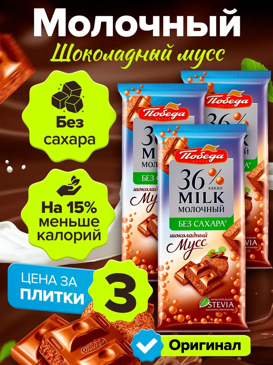 Do you love delicious milky aerated chocolate? Then try the new Mousse dessert from the Russian Pobeda factory! This sugar-free confection comes in a set of 3 bars. Stevia, a mild, natural sweetener, is used as a sweetener. It's virtually calorie-free and doesn't affect glucose levels. One bar contains only 470 kcal. It also contains the natural prebiotic inulin. This component helps restore the microflora of the stomach and intestines, lowers cholesterol. It also removes harmful substances and improves calcium absorption. It's suitable for type 2 diabetics and those who value a healthy diet. This recipe, made with real cocoa butter, contains 15% fewer calories, making it ideal for those trying to lose weight. This is an excellent choice as a gift supplement or as a standalone present for family and friends, a friend, or a colleague. The set is perfect for mom and dad, a beloved grandparent, wife and husband, or a sister and brother. A favorite teacher, caregiver, friend, or friend will love this surprise. It's an excellent choice as a sweet gift for a birthday, anniversary, New Year's 2024-2025, or any holiday. Your guests will appreciate this dietary, diabetic chocolate. This low-calorie treat is convenient to take to school and work, on walks and trips for a quick snack. Teenagers, adults, men and women, and girls will love this sweet treat. This delicious and healthy product is a wonderful choice with tea, especially coffee, and for a snack. The chocolates are packaged in a box to protect them from breakage during transportation. Try this wonderful dessert, where taste and health complement each other perfectly!