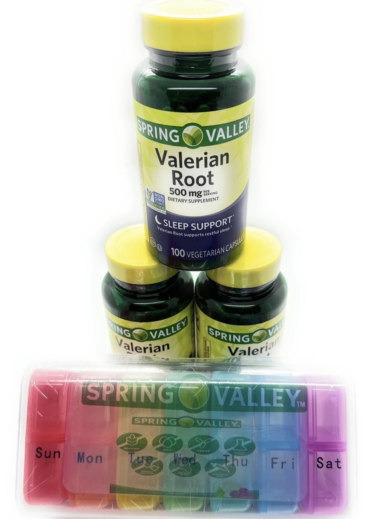 3 Bottles of Spring Valley Valerian Root Sleep Aid Dietary Supplement Capsules, 500 mg, 100 Count each Bottle. Total count of 300 Capsules. Spring Valley Valerian Root Capsules are made with organic valerian root. This dietary supplement combines 400 milligrams of organic valerian root extract and 100 milligrams of organic valerian root powder. Plus, it's Non-GMO Project Verified and contains no gluten, yeast, milk or milk derivatives, lactose, sugar, soy, artificial color or artificial flavor. Take two capsules before bedtime and wake up feeling refreshed. Trust Spring Valley Valerian Root Capsules when it comes to moving toward a healthier life. Spring Valley understands living a healthy, balanced lifestyle is the key to being your best self. With an affordable range of products inspired by nature, Spring Valley supports your and your family's health and holistic wellbeing. . Made with organic valerian root extract and powder Non-GMO Project Verified Dietary supplement for sleep support Enhance Sleep Quality: Spring Valley Valerian Root Capsules 500mg support restful sleep naturally, Valerian Root for sleep support Valerian Root 500mg in each capsule help support sleep Convenient Dosage: Enjoy the benefits of Valerian Root Capsules 500mg with Spring Valley's easy-to-use 100 Count bottle Quality Assurance: Trust Spring Valley for premium Valerian Root Capsules 500mg, a natural choice for better sleep The VicVan pill organizer Simplifies the process of managing your medications. You can easily load all your pills in advance, accommodating any size. This allows you to efficiently plan for an entire week, freeing up your time for what matters most. With a secure, easy-to-open design for both the outer container and the travel-sized pill boxes, you can trust that your pills will remain safe even if accidentally dropped. Each daily pill box detaches, enabling you to take only what you need for the day. It's perfectly sized to fit in your purse or pocket, making it ideal for life on the go! Keep track of your doses easily with 7 vibrant, labeled compartments designed to help you monitor your medications. Crafted from BPA-free, food-grade materials, this pill case ensures your medications remain safe, clean, and secure. Protect your health with peace of mind.100 capsules per bottle. Free of gluten, wheat, and lactose. Kosher and Halal. Supports safe non addictive sleep.