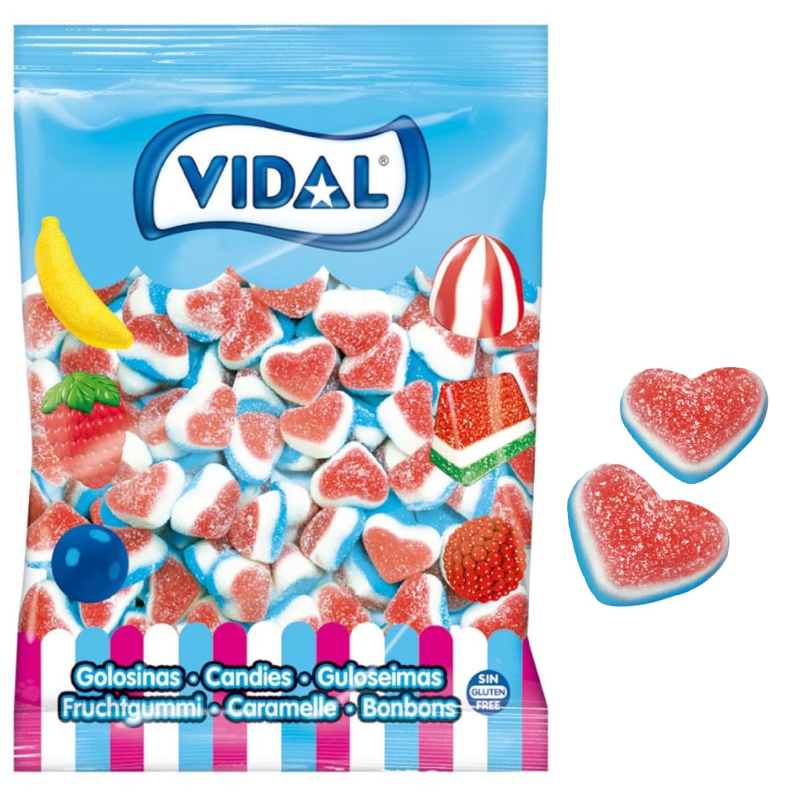 Vidal tricolor heart-shaped sweets with a triple-layered coating of blue, white, and red. 1.6 kg bag containing approximately 250 pieces. INSTRUCTIONS FOR USE Eat directly from the packaging. Suitable for everyone.