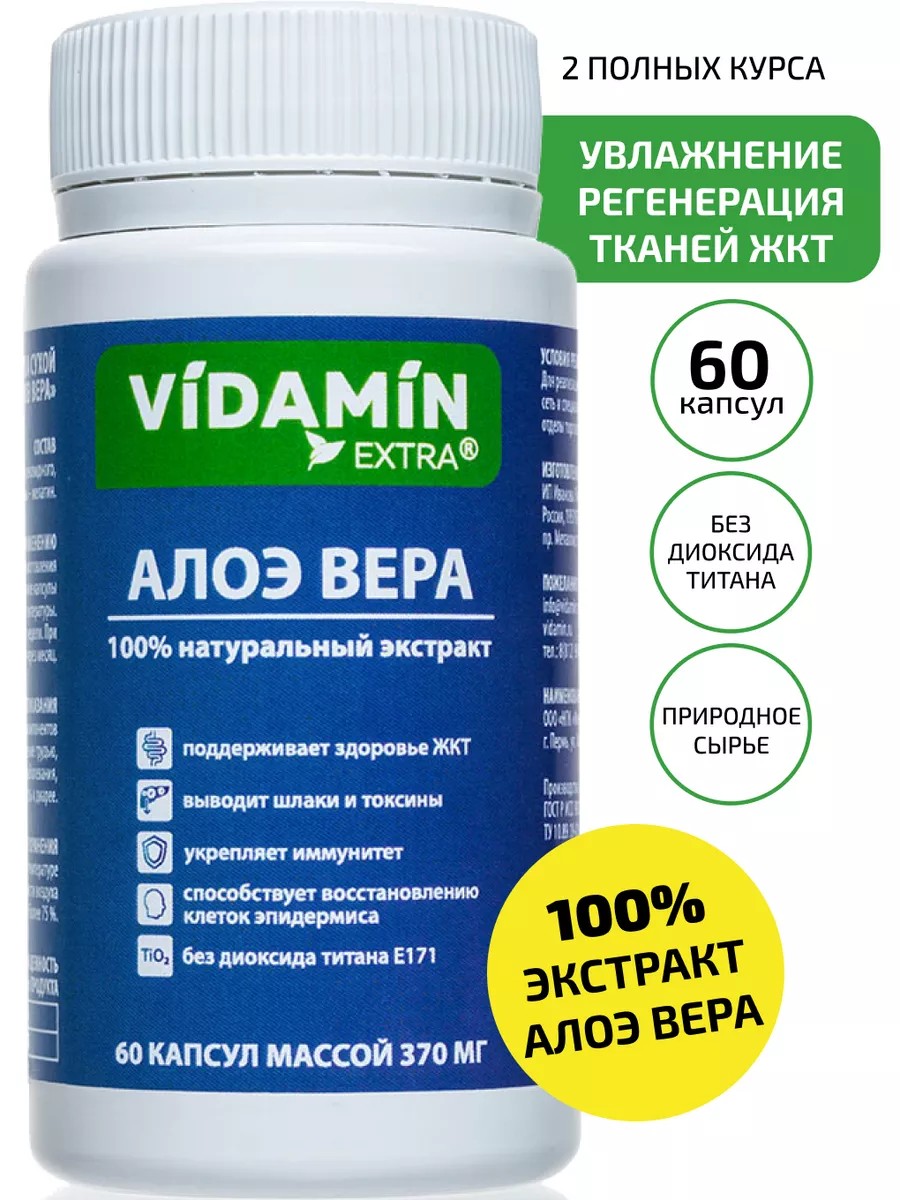 Алоэ вера в капсулах detox - это уникальное растение с множеством полезных свойств, способное оказывать многостороннее положительное воздействие на организм. Натуральный экстракт алоэ VIDAMIN EXTRA помогает нормализовать работу пищеварительной системы, укрепляет иммунитет, снижает воспаление и даже помогает похудеть благодаря своему слабительному эффекту. Этот продукт также очищает организм, улучшает состояние кожи и волос, помогает при заболеваниях ЖКТ, кожных проблемах, а также является отличным сопутствующим средством при приеме антибиотиков и химиотерапии. Рекомендуется принимать по 1 капсуле в день во время еды на протяжении 2-3 недель. Попробуйте алоэ вера в капсулах detox для общего укрепления организма и поддержания здоровья. Алоэ вера в капсулах detox - это не просто натуральный продукт, это целый витаминный комплекс, который помогает взрослому организму оставаться в тонусе и поддерживать здоровье. Одно из ключевых свойств этого продукта - способствование похудению. Благодаря своему натуральному слабительному эффекту, алоэ вера помогает очистить организм от токсинов и шлаков, что способствует естественному снижению веса. Это очищение, в свою очередь, положительно влияет на общее состояние организма, улучшает самочувствие и повышает энергию. Алоэ, или как его еще называют ""алый"", является мощным антиоксидантом, который помогает бороться с вредными воздействиями окружающей среды и поддерживает иммунитет взрослого организма. Это детокс для похудения и очищения в удобной форме капсул. Витамины для кожи, содержащиеся в алоэ вера, улучшают ее состояние, делают ее более упругой и здоровой. Кроме того, алоэ вера содержит витамины для иммунитета, которые помогают укрепить защитные функции организма и улучшить общее состояние здоровья. Это особенно важно для взрослых, чья иммунная система может быть ослаблена из-за стресса, недостатка сна или неправильного питания. Попробуйте алоэ вера в капсулах detox и ощутите все преимущества этого уникального продукта.