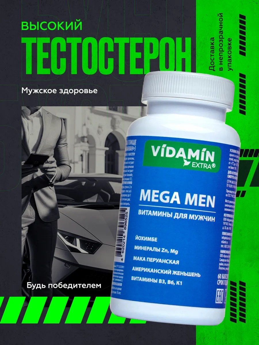 MEGA MEN - это энергетический спортивный комплекс от VIDAMIN EXTRA, специально разработанный для мужчин, которые ценят свое здоровье и активный образ жизни. Составленный из натуральных ингредиентов, включая маку перуанскую, йохимбе, женьшень и другие активные компоненты, этот продукт помогает повысить уровень тестостерона, улучшить выносливость и физическую форму, а также активизировать половую функцию и обмен веществ.